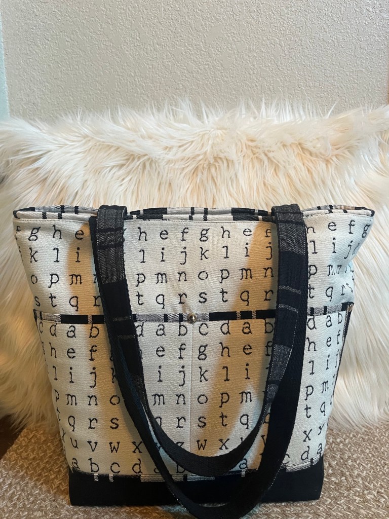 ABCs This is a 16” X 13” X 6” Tote with 28” straps, zip closure, double slip pockets in front, a back zip pocket, purse feet, 6 interior slip pockets, as well as a zip pocket $74 ABCs (front) ABCs (interior) ABCs (back) Share this:Tweet