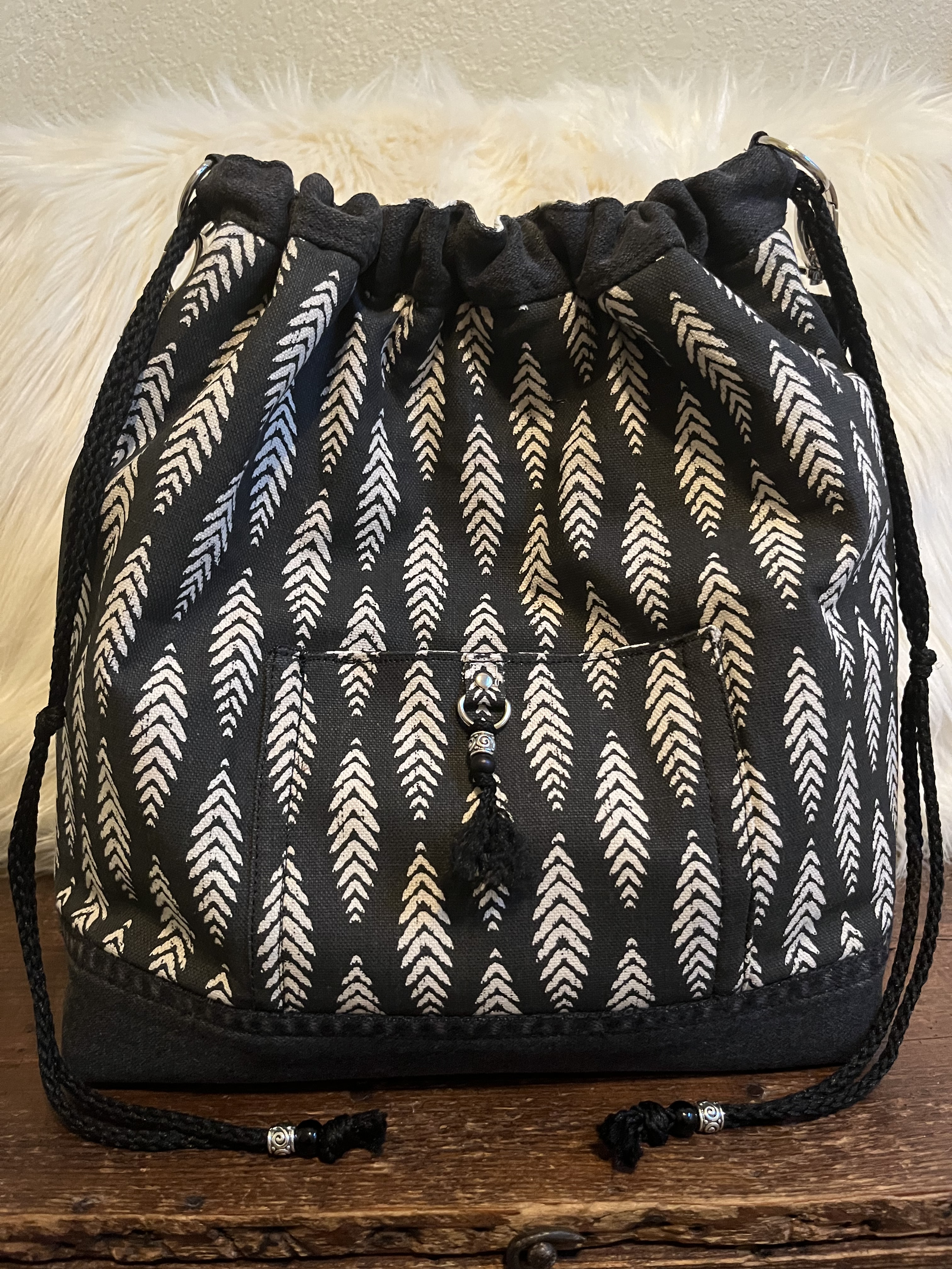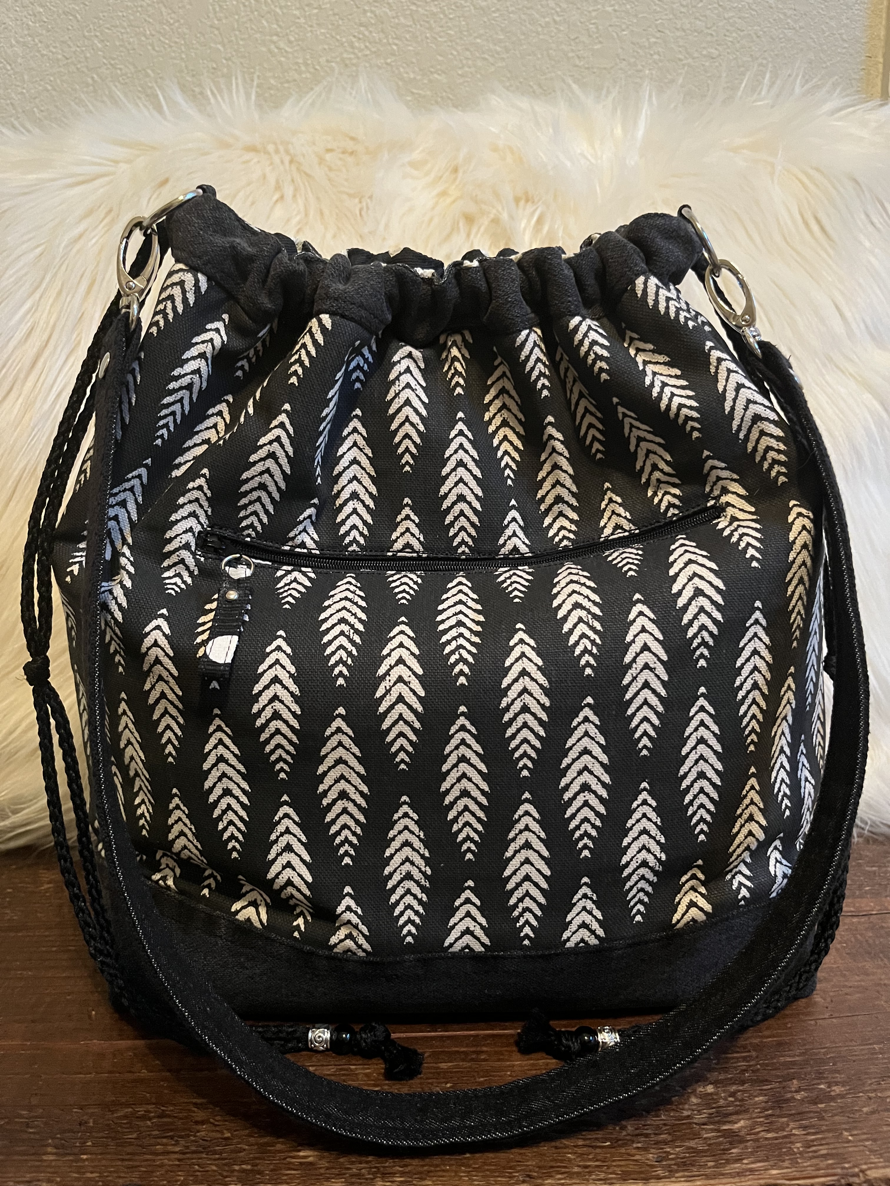 All in A Row This is a 14″ x 13″ x 5″ Drawstring/snap closure handbag with a 32″ strap, a front I-Phone slip pocket, a back zip pocket, 6 interior slip pockets as well as a zip pocket. $74 All in A Row (front) All in A Row (interior) All in A Row (back) Share this:Tweet
