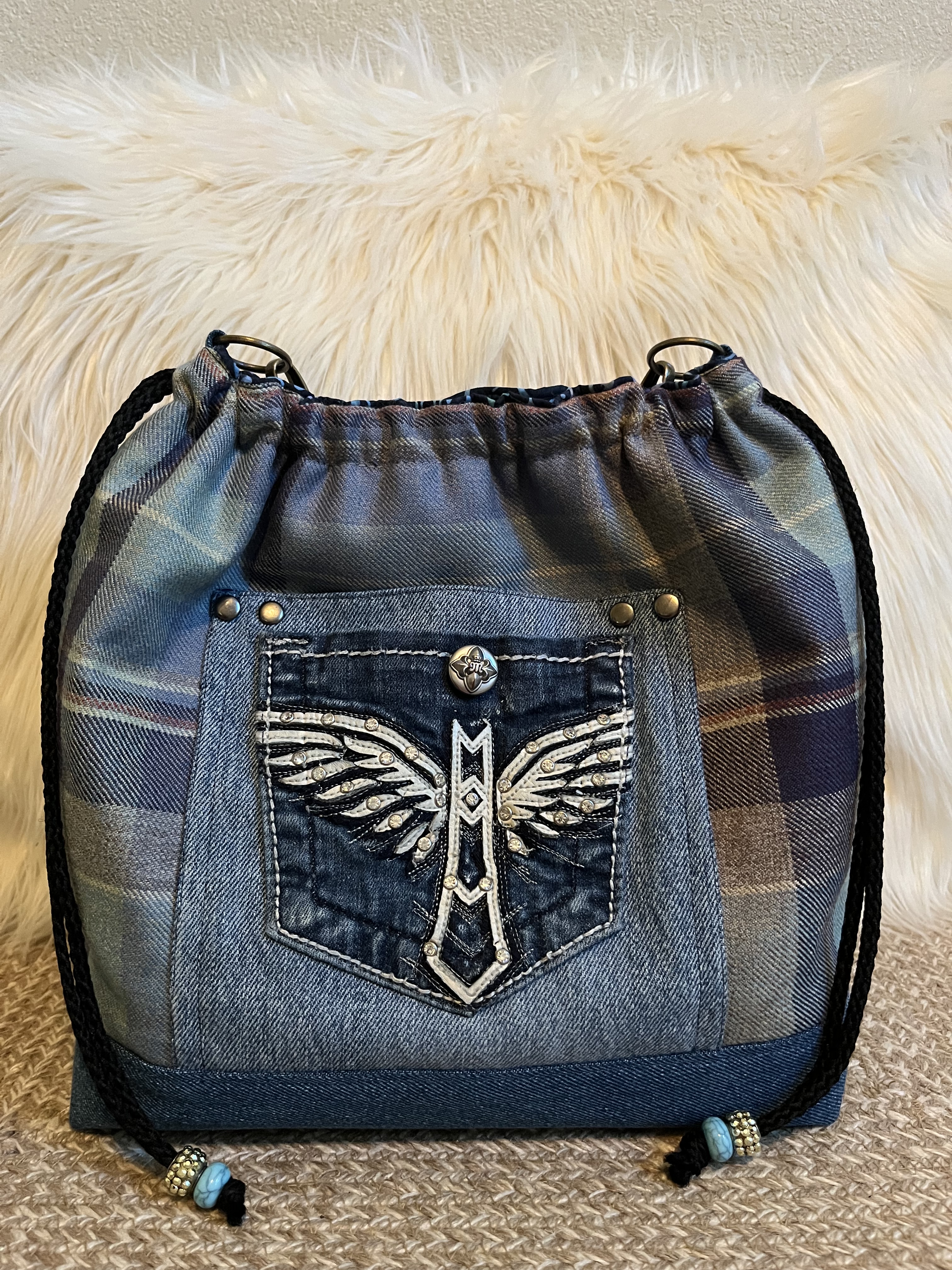 Angel Wings This is a 14″ x 12″ x 5″ Snap/draw Closure shoulder Handbag with a 32″ strap, front double slip pockets, a back zip pocket, purse feet, 6 interior slip pockets as well as a zip pocket. $76 Angel Wings (front) Angel Wings (interior) Angel Wings (back) Share this:Tweet