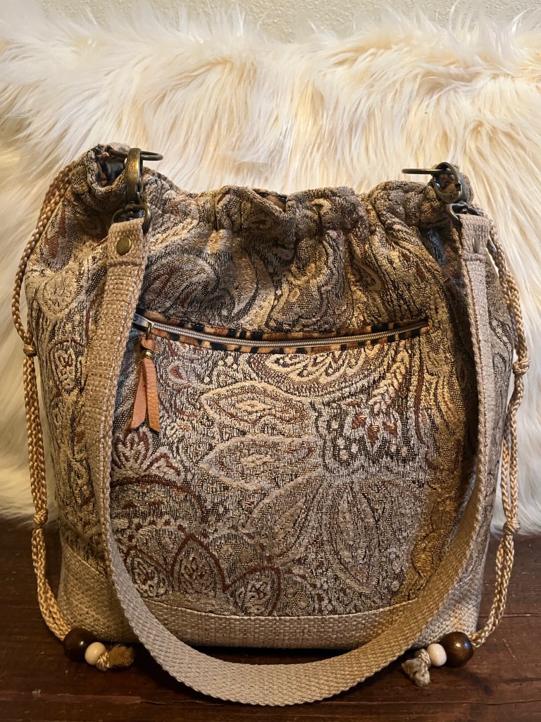 Aristocrat This is a 14” x 12” x 5” draw/snap closure, 32” strap, front double slip pockets, back zip pocket purse feet, 6 interior slip pockets, 1 zip pocket. $75 Aristocrat (front) Aristocrat (interior) Aristocrat (back) Share this:Tweet