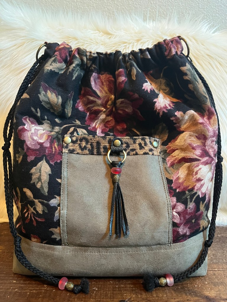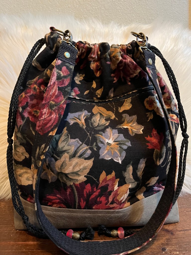 Autumn Afternoon This is a 14″ x 13″ x 5″ Drawstring/snap closure, 33″ strap, Purse feet, 3 front slip pockets, a back zip pocket, 6 interior slip pockets, as well as a zip pocket. $74 Autumn Afternoon (front) Autumn Afternoon (interior) Autumn Afternoon (back) Share this:Tweet