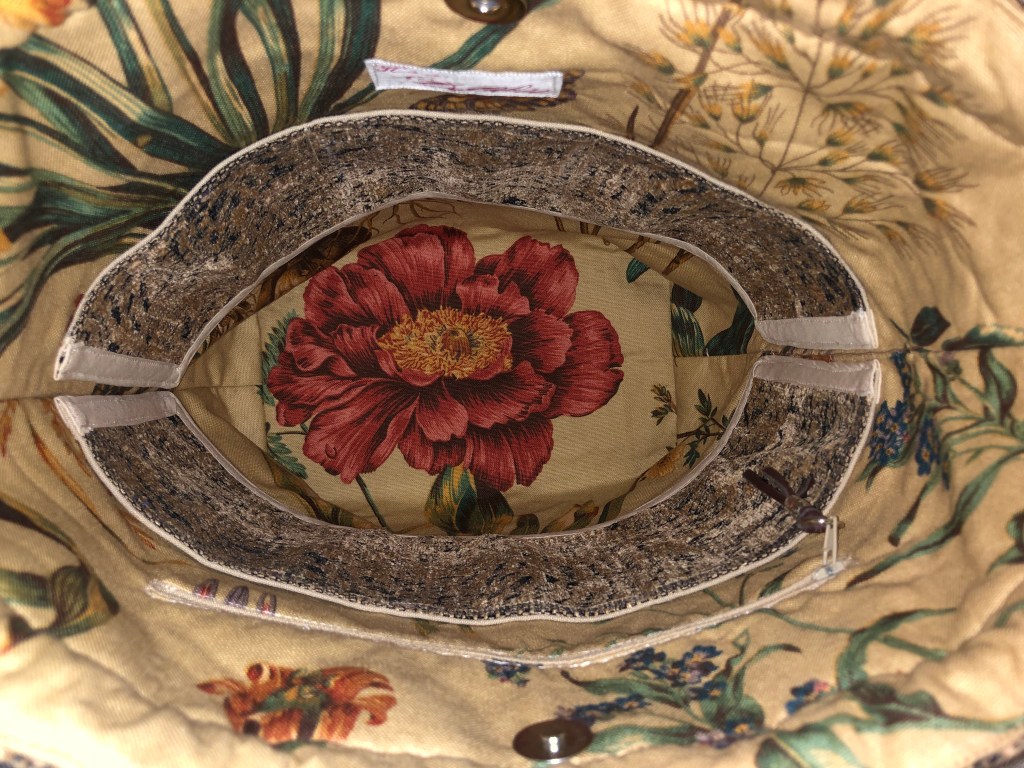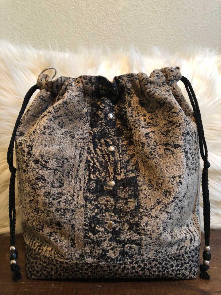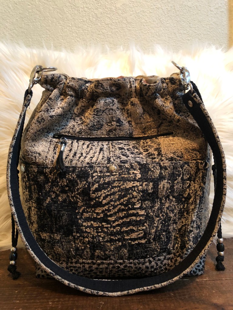 Caramel Cookie This is a 13″ x 13″ x 5″ with a draw/snap closure, a 33″ strap, purse feet, a back zip pocket and 2 slip pockets, embellished front, 6 interior slip pockets as well as a zip pocket. $72 Caramel Cookie (front) Caramel Cookie (interior) baCaramel Cookie (back) Share this:Tweet