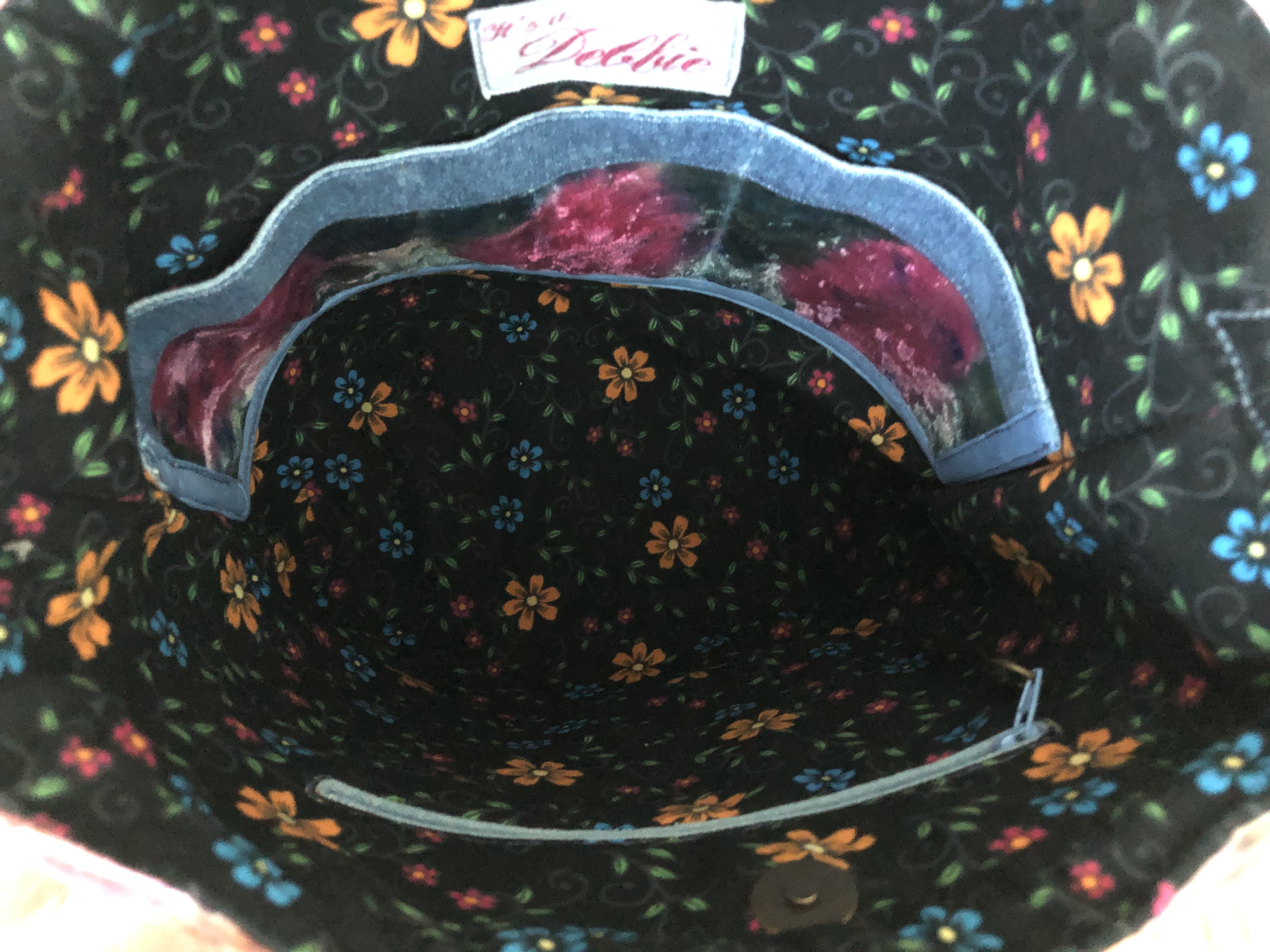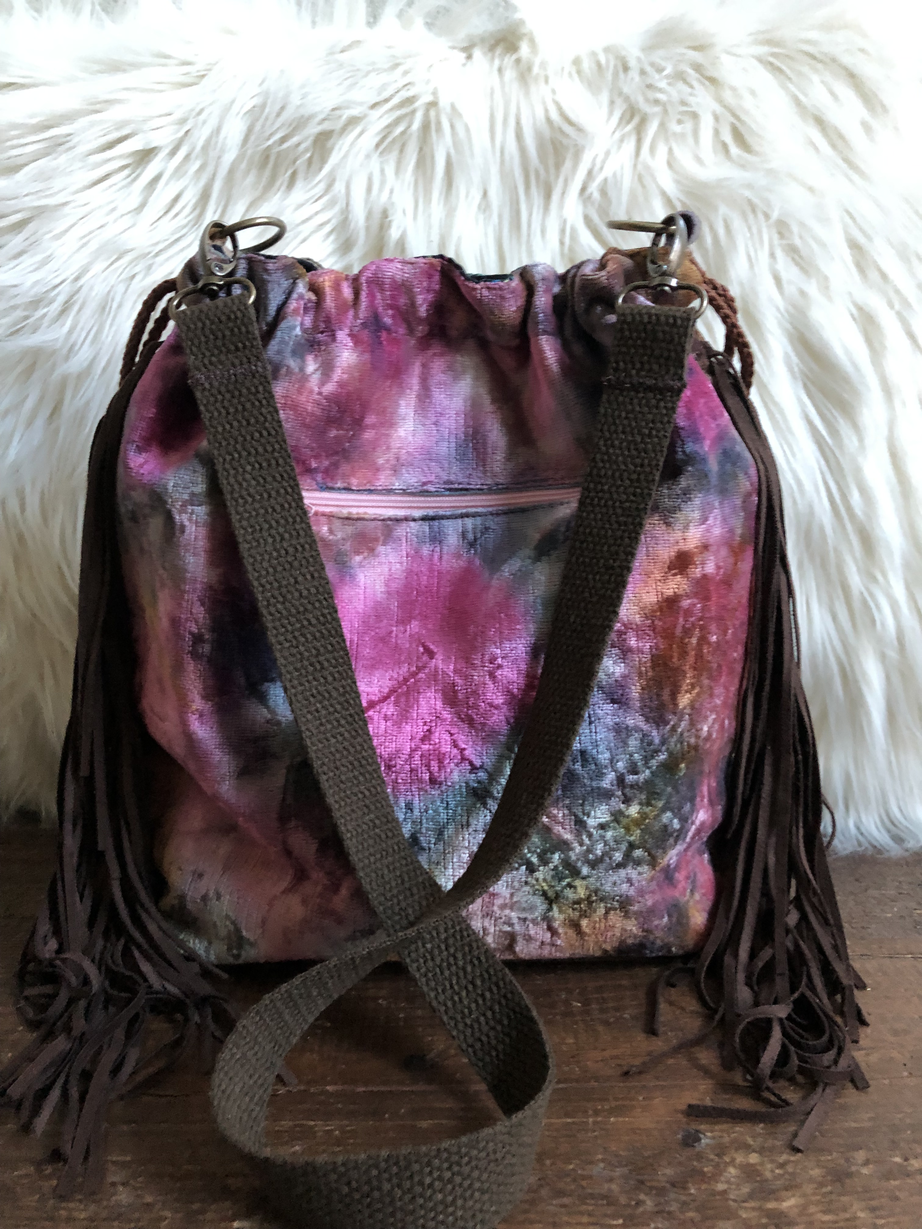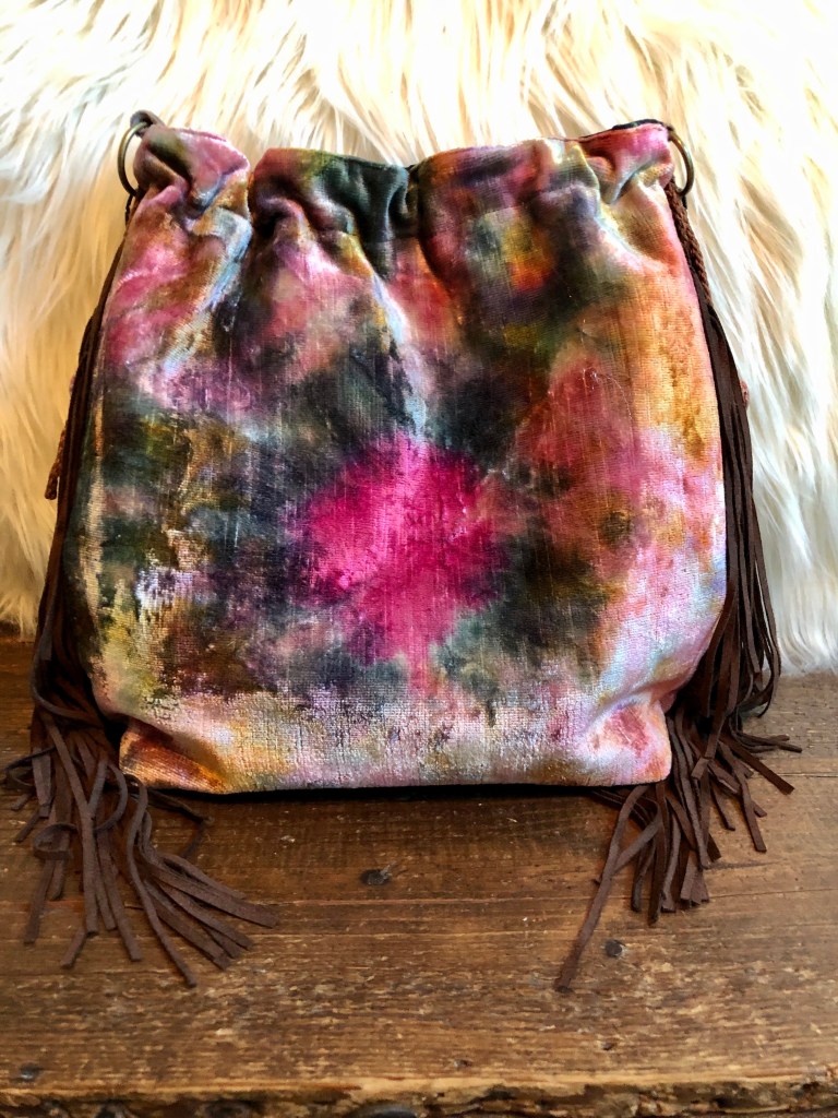 Color Collage This is a 13″ x 11″ x 4″ tie-dyed, velvet drawstring, handbag with a 34″ strap, a back zip pocket, fringe, purse feet, an interior zip pocket with 3 slip pockets. $72 Color Collage (front) Color Collage (interior) Color Collage (back) Share this:Tweet