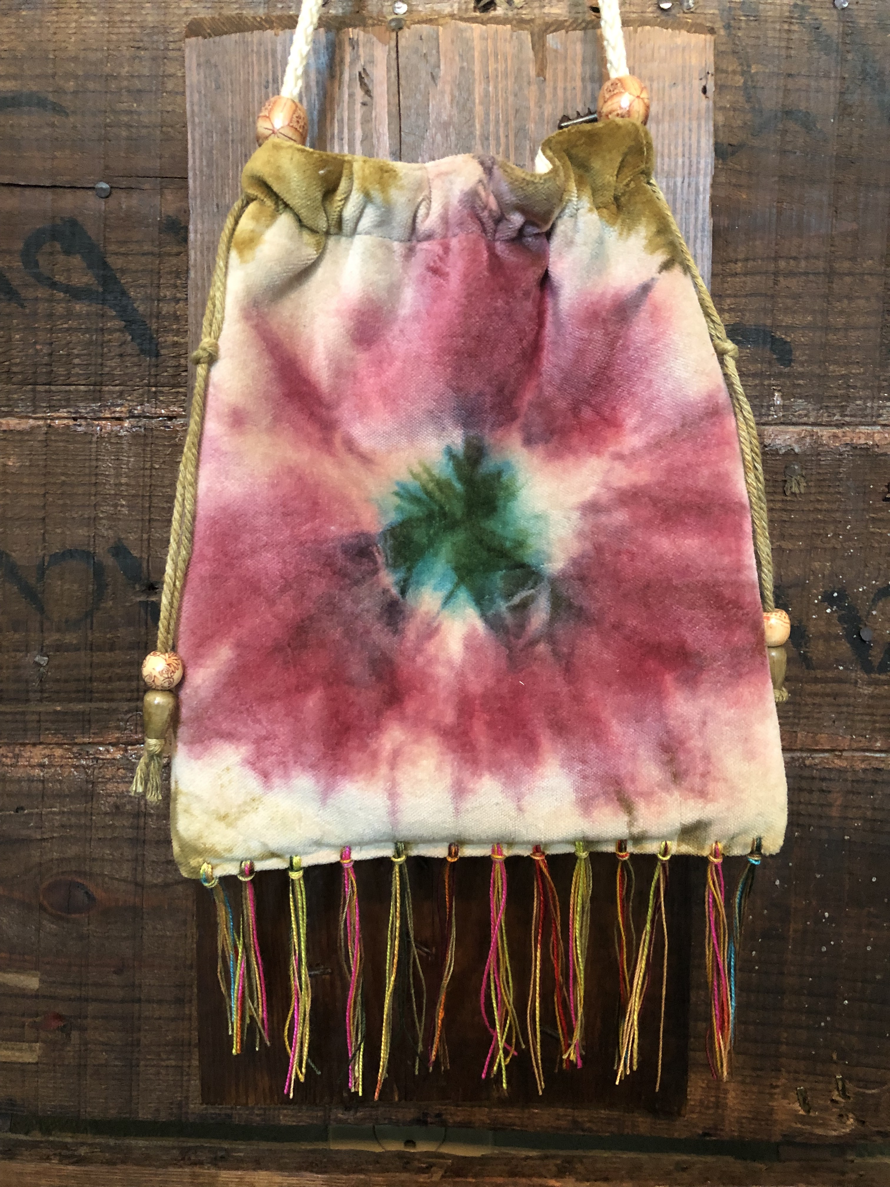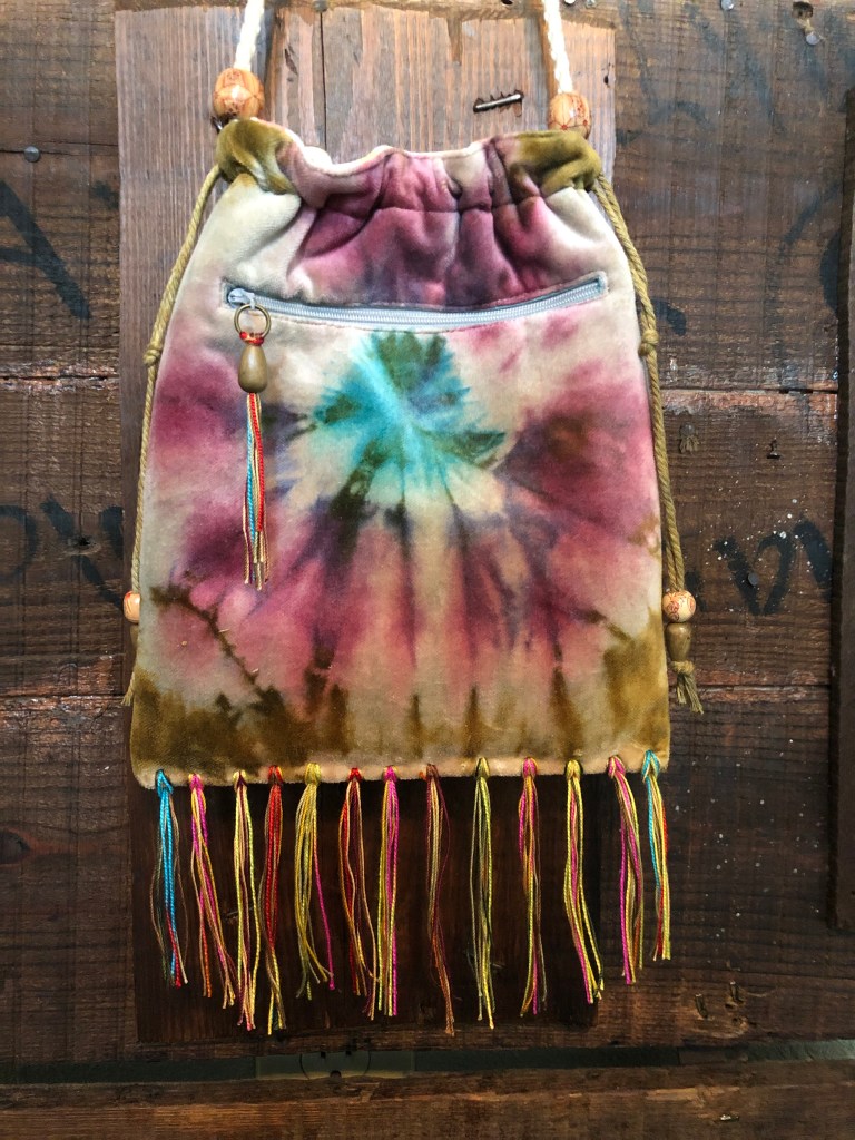 Copy Cat This is a 8″ x 10″ Cross-body with a 52″ strap, drawstring closure, back zip pocket an interior slip pocket. It is hand tie dyed and hand tied fringe. $53 Copy Cat (front) Copy Cat (interior) Copy Cat (back) Share this:Tweet