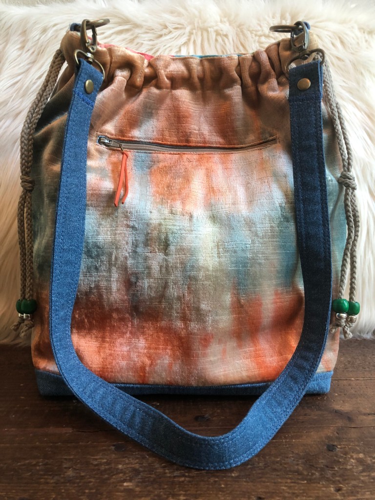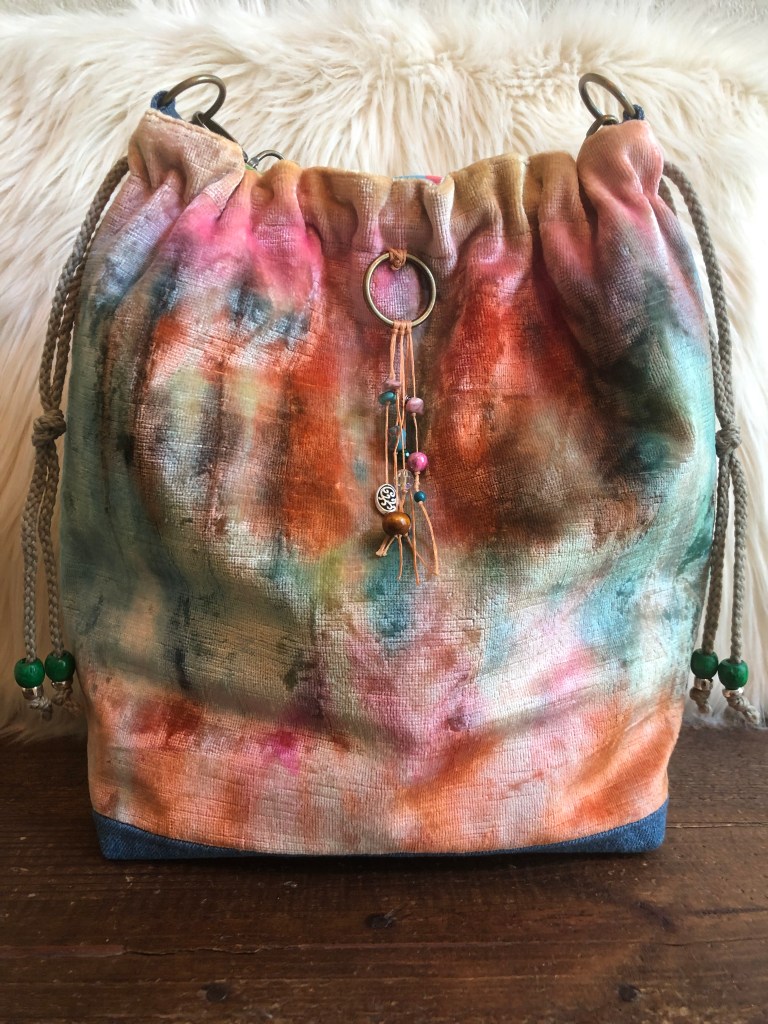 Coral Reef 13″ x 12″ x 4″ Tie dyed Velvet Drawstring/Shoulder handbag with a 32″ strap, a back zip pocket, purse feet and 6 interior slip pockets as well as a zip pocket $72 Coral Reef (front) Coral Reef (interior) Coral Reef (back) Share this:Tweet