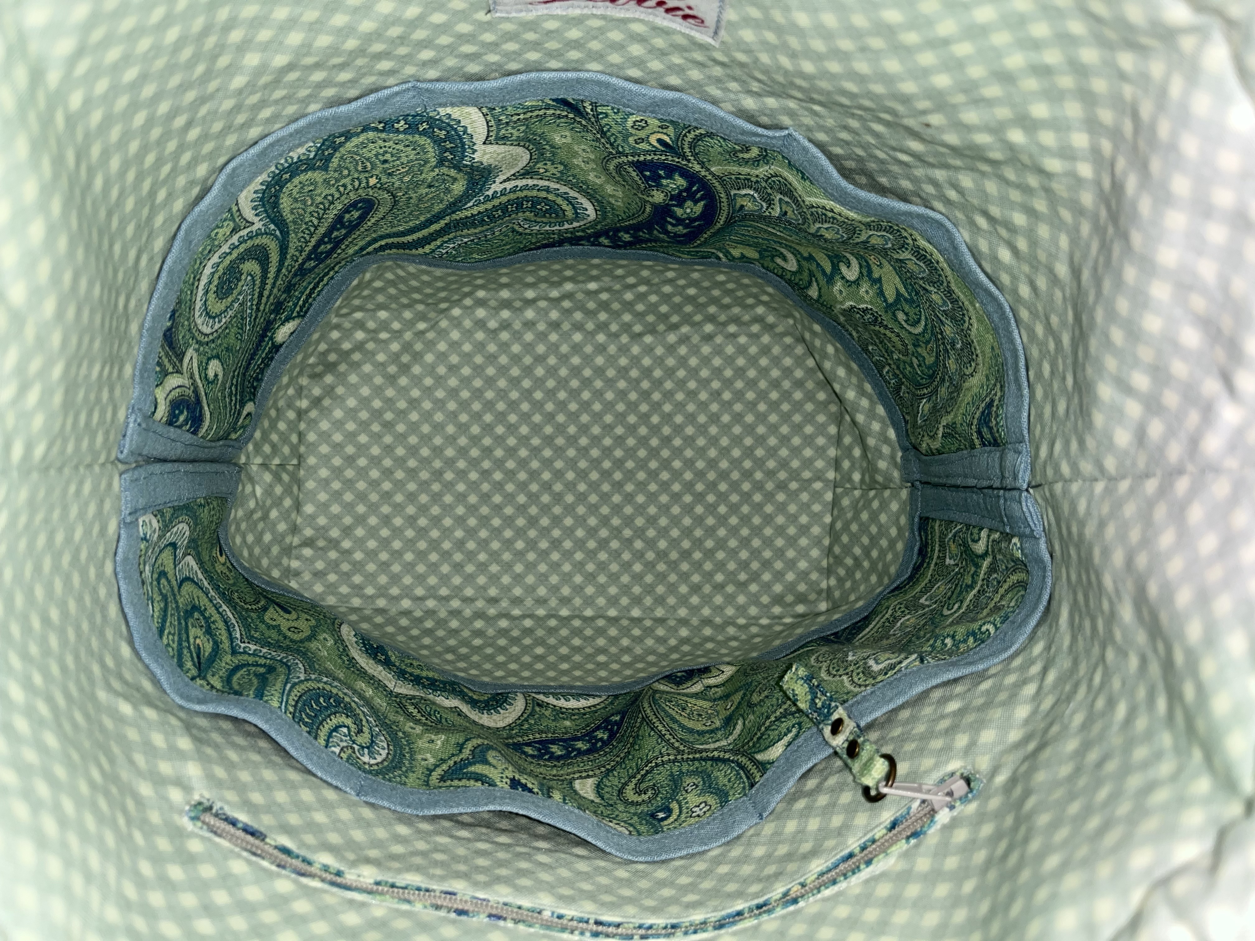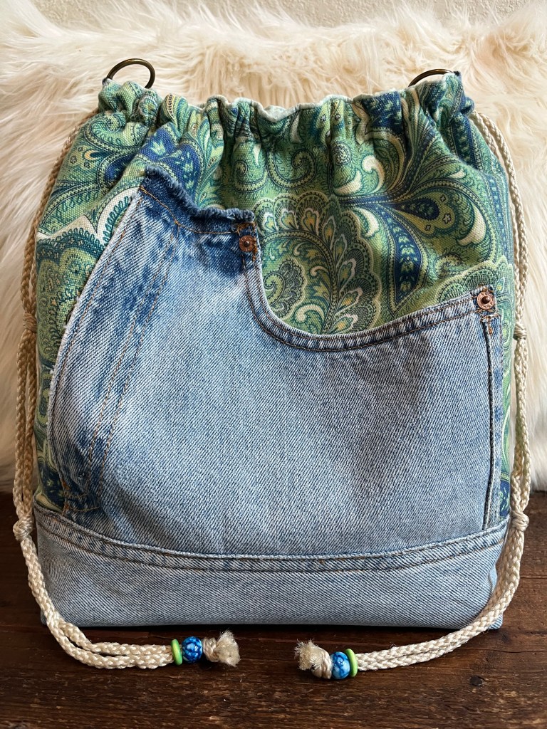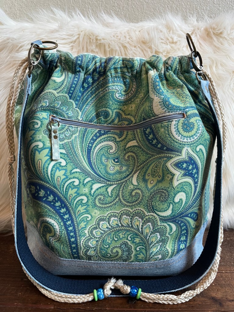 Deep Pockets This is a 13″ x 13″ x 5″ drawstring/snap shoulder Bag with a 33″ strap, a front slip pocket, a back zip pocket, purse feet, 6 interior slip pocket as well as a zip pocket. $74 Deep Pockets (front) Deep Pockets (interior) Deep Pockets (back) Share this:Tweet