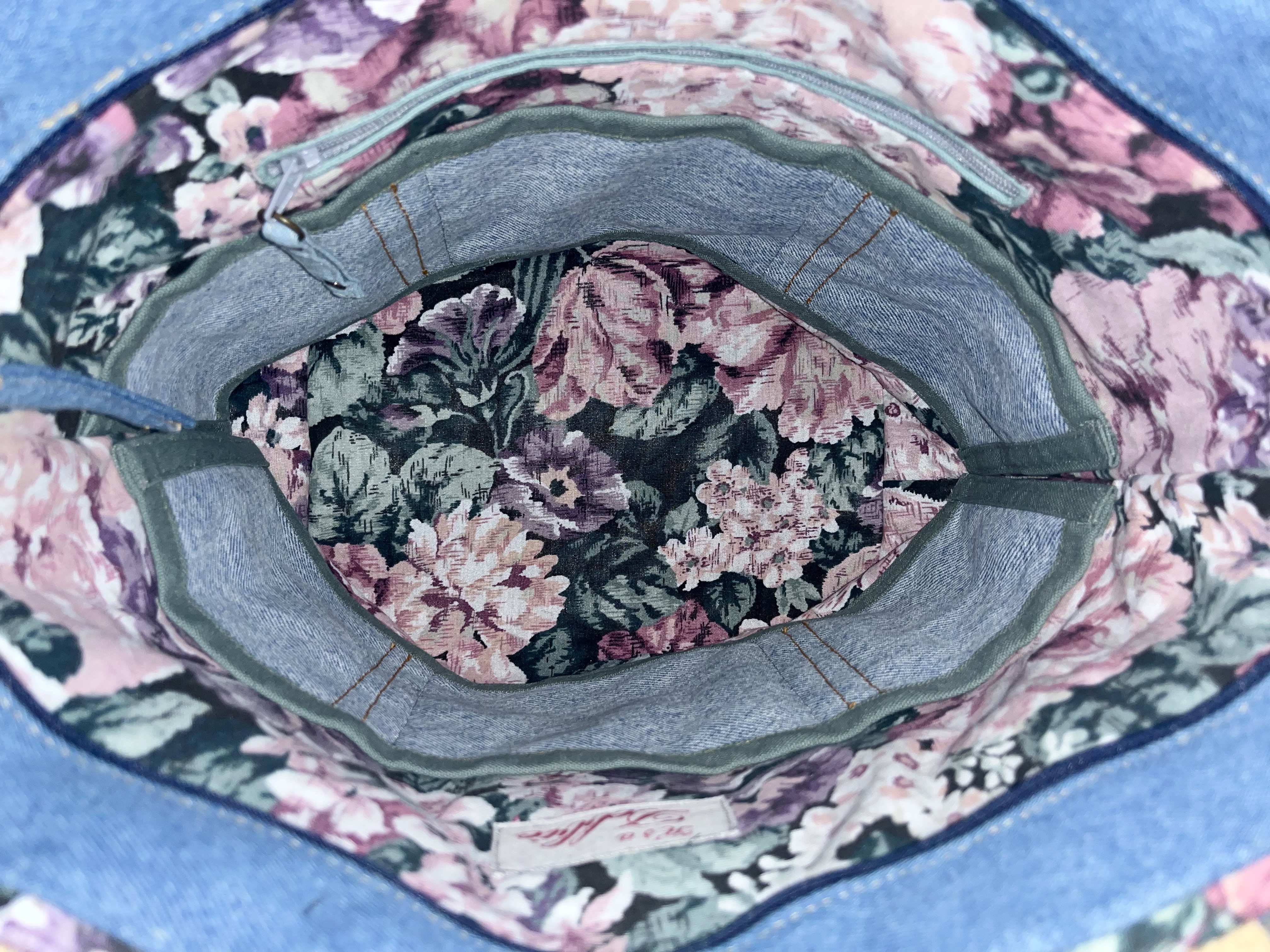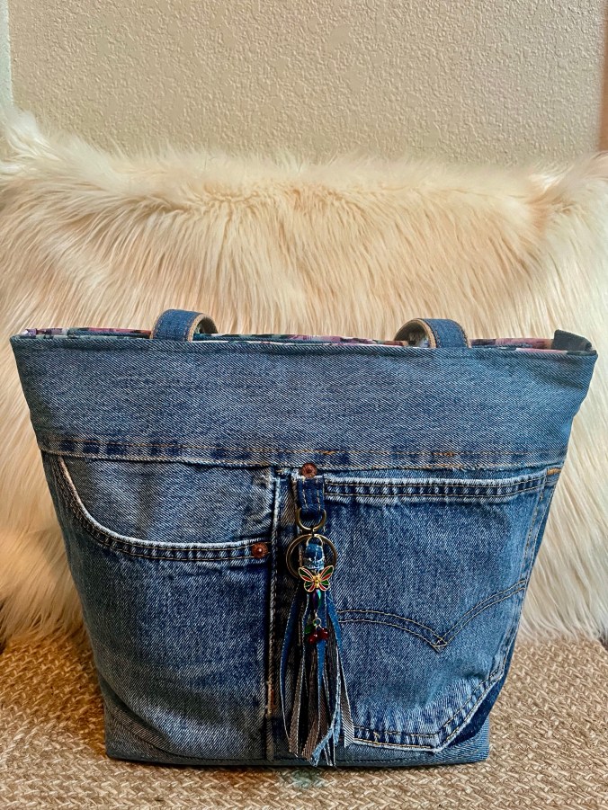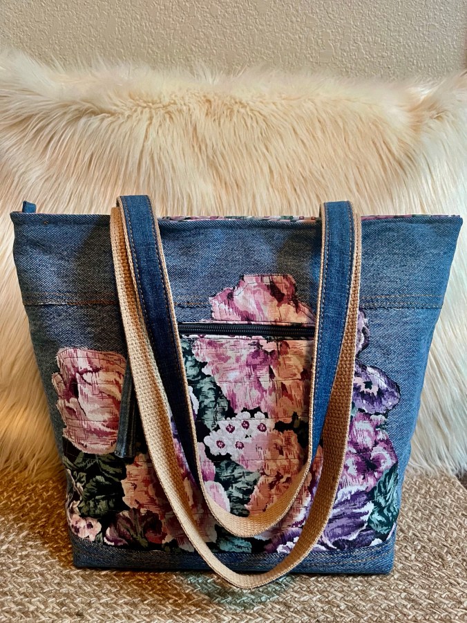Denim Debbie 1 This is a 14″ x 11″ x 5″ Tote with 26” straps, a zip closure, purse feet, front double slip pockets, a back zip pocket, 6 interior slip pockets as well as a zip pocket $80 Denim Debbie 1 (front) Denim Debbie 1 (interior) Denim Debbie 1 (back) Share this:Tweet