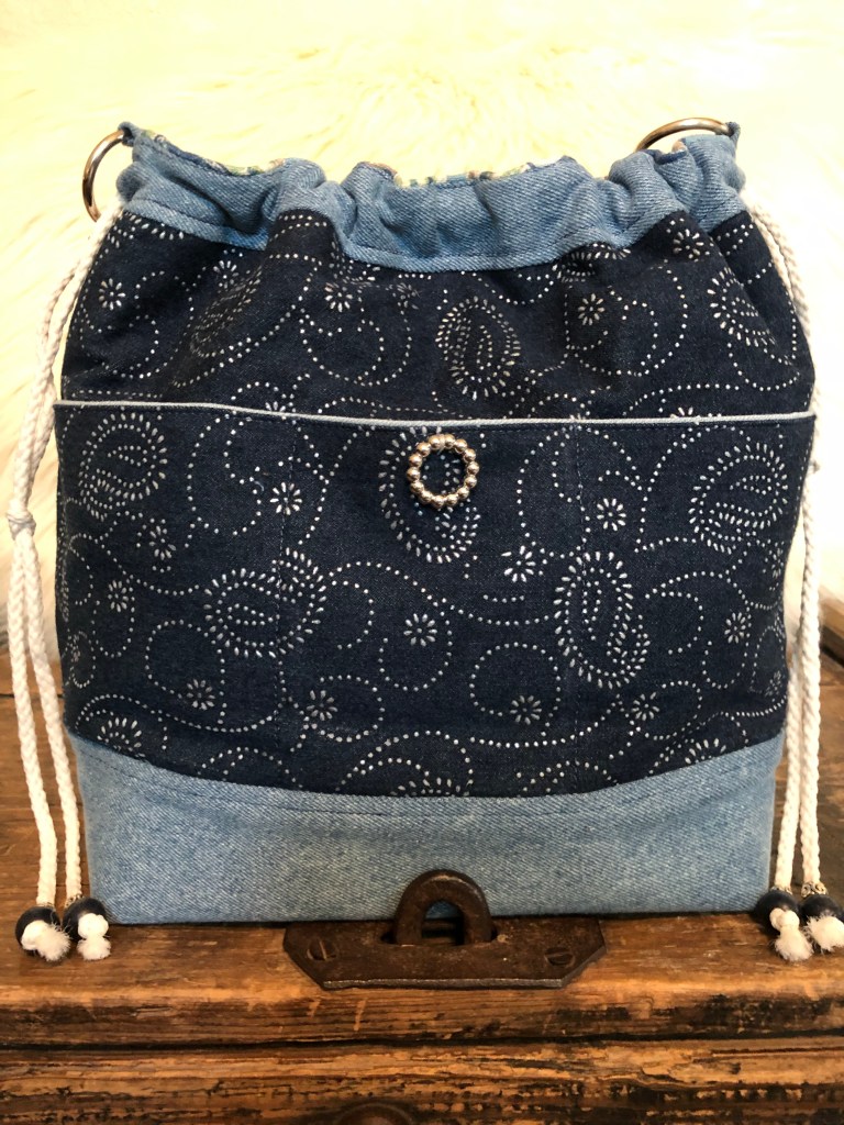 Denim Paisleys This is a 13″ x 12″ x 5″ Drawstring/Shoulder Bag with a 31″ strap, purse feet, front triple slip pockets, a back zip pocket, 6 interior slip pockets as well as a zip pocket. $72 Denim Paisleys (front) Denim Paisleys (interior) Denim Paisleys (back) Share this:Tweet