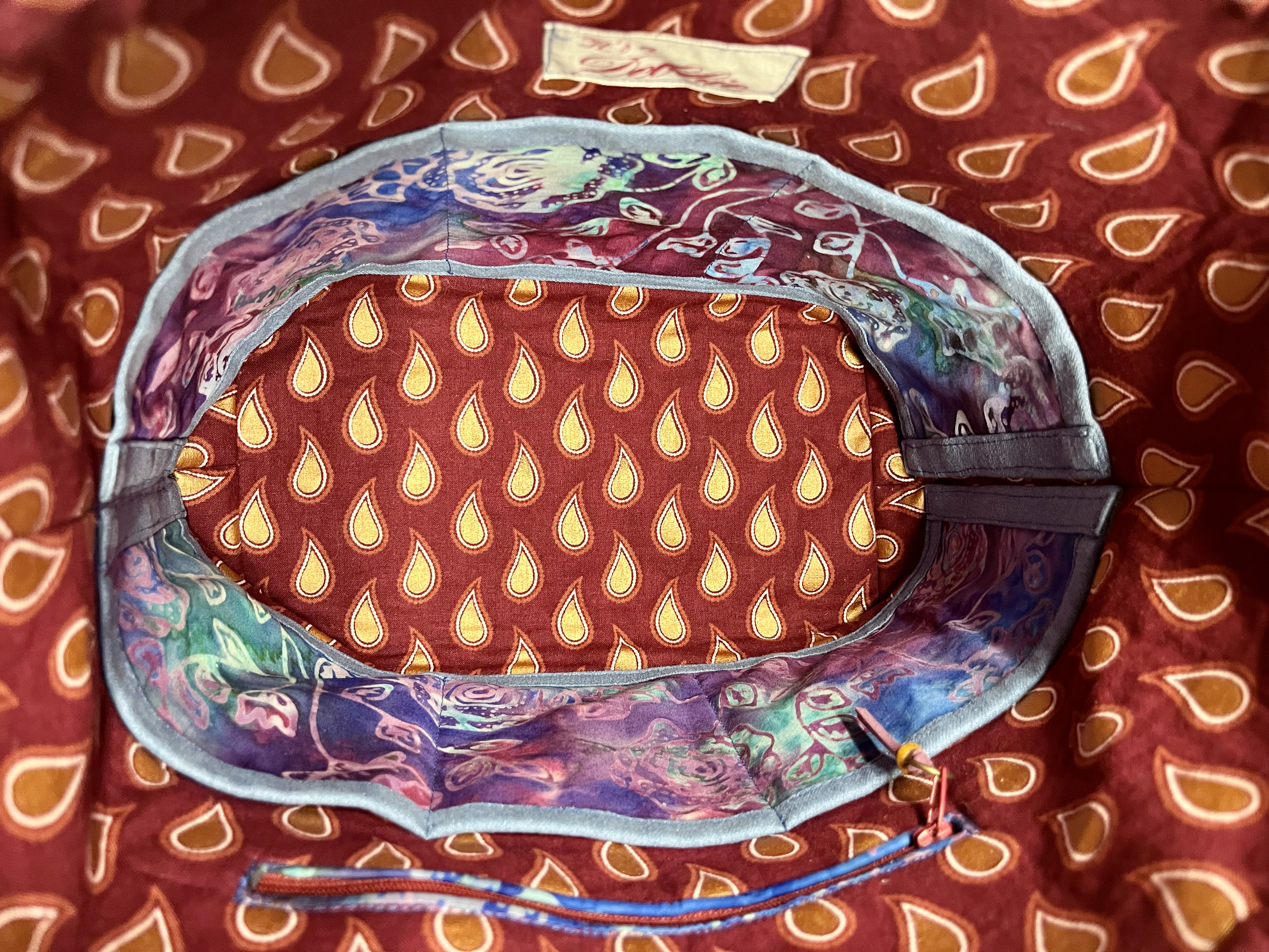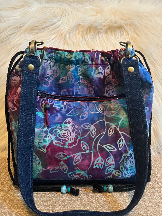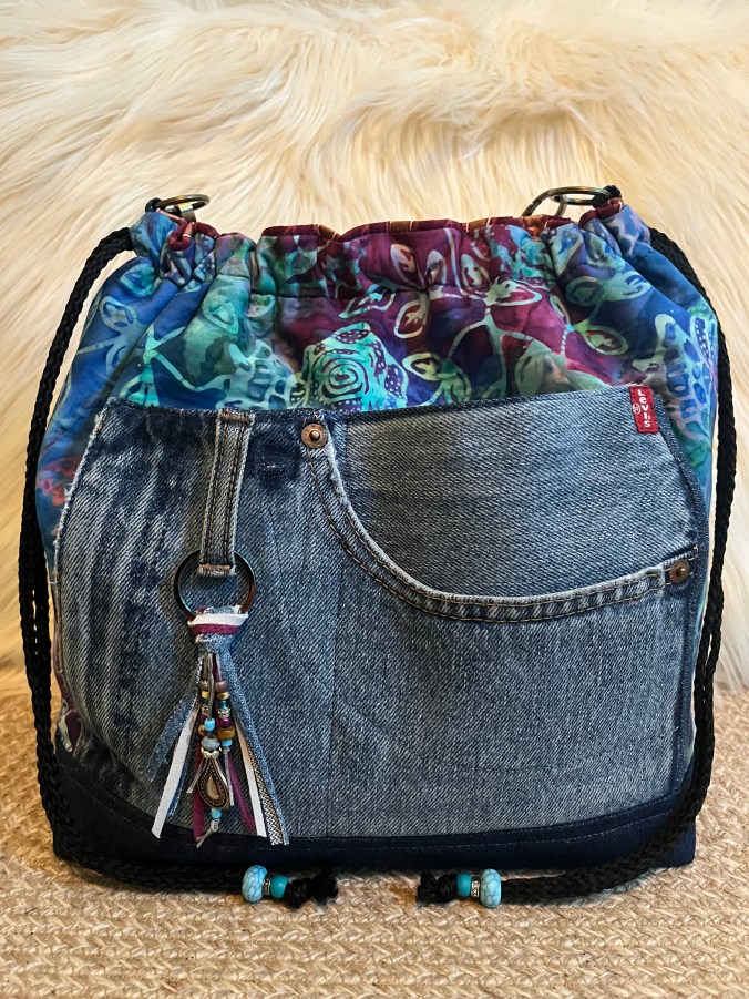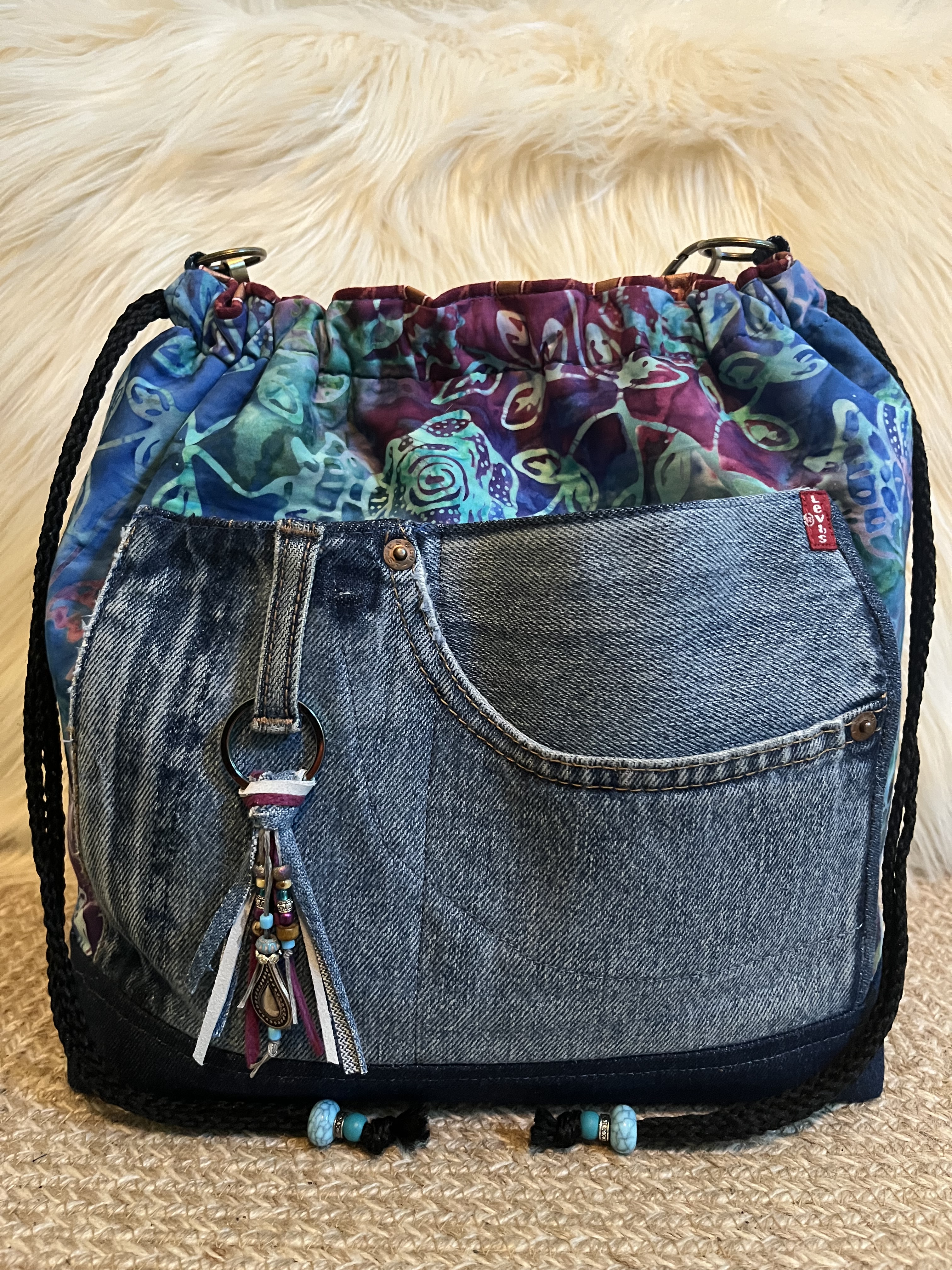 Dungaree Daze This is a 14″ x 12″ x 5″ Drawstring/Shoulder Bag with a 31″ strap, double front slip pockets, a back zip pocket, purse feet, 6 interior slip pockets as well as a zip pocket. $72 Dungaree Daze (front) Dungaree Daze (Interior) Dungaree Daze (Back) Share this:Tweet