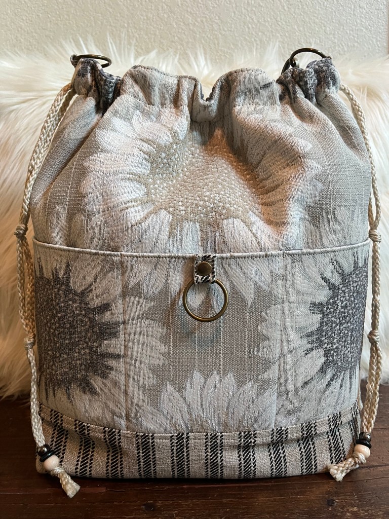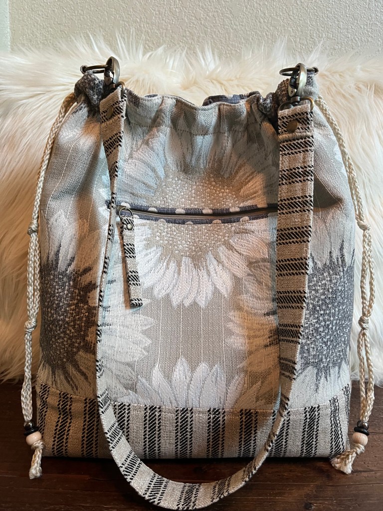 Dusk to Dusk This is a 14” x 14” x 5” with a 33” strap, purse feet, 3 front slip pockets, a back zip pocket, 6 interior slip pockets and a zip pocket as well. $74 Dusk to Dusk (front) Dusk to Dusk (interior) Dusk to Dusk (back) Share this:Tweet