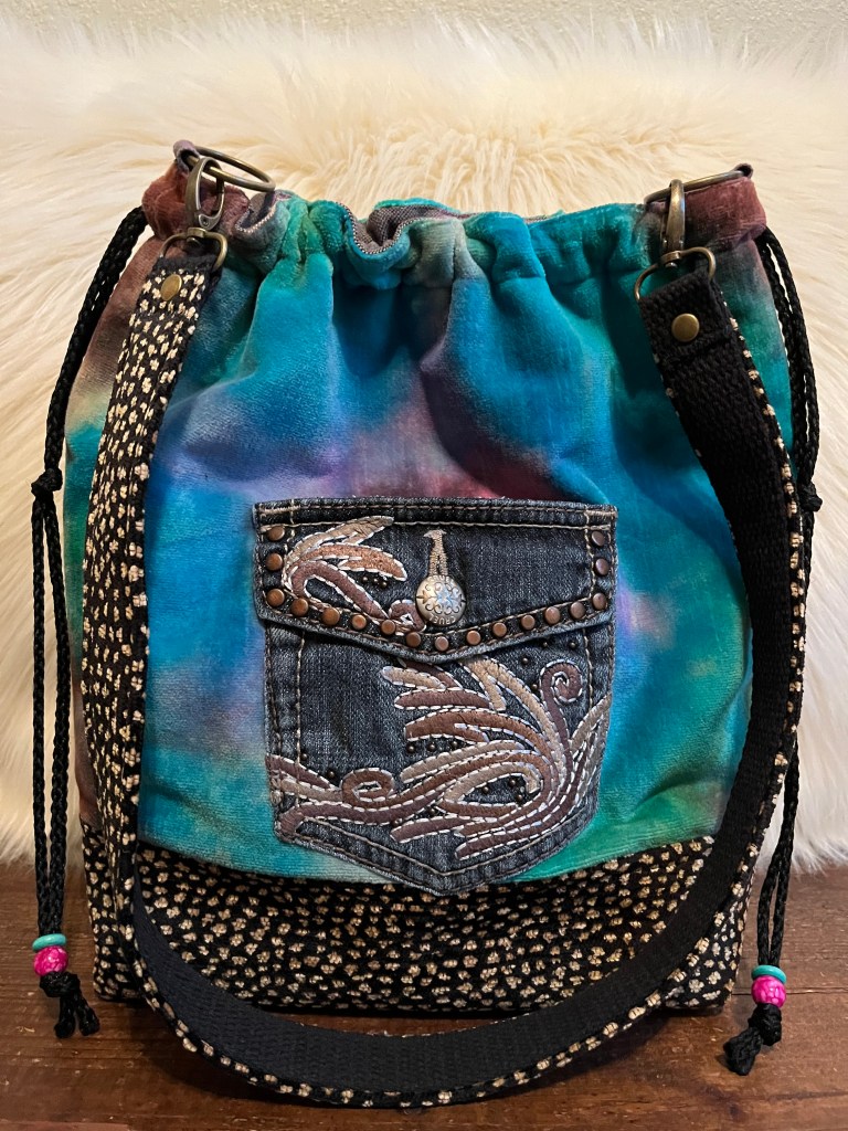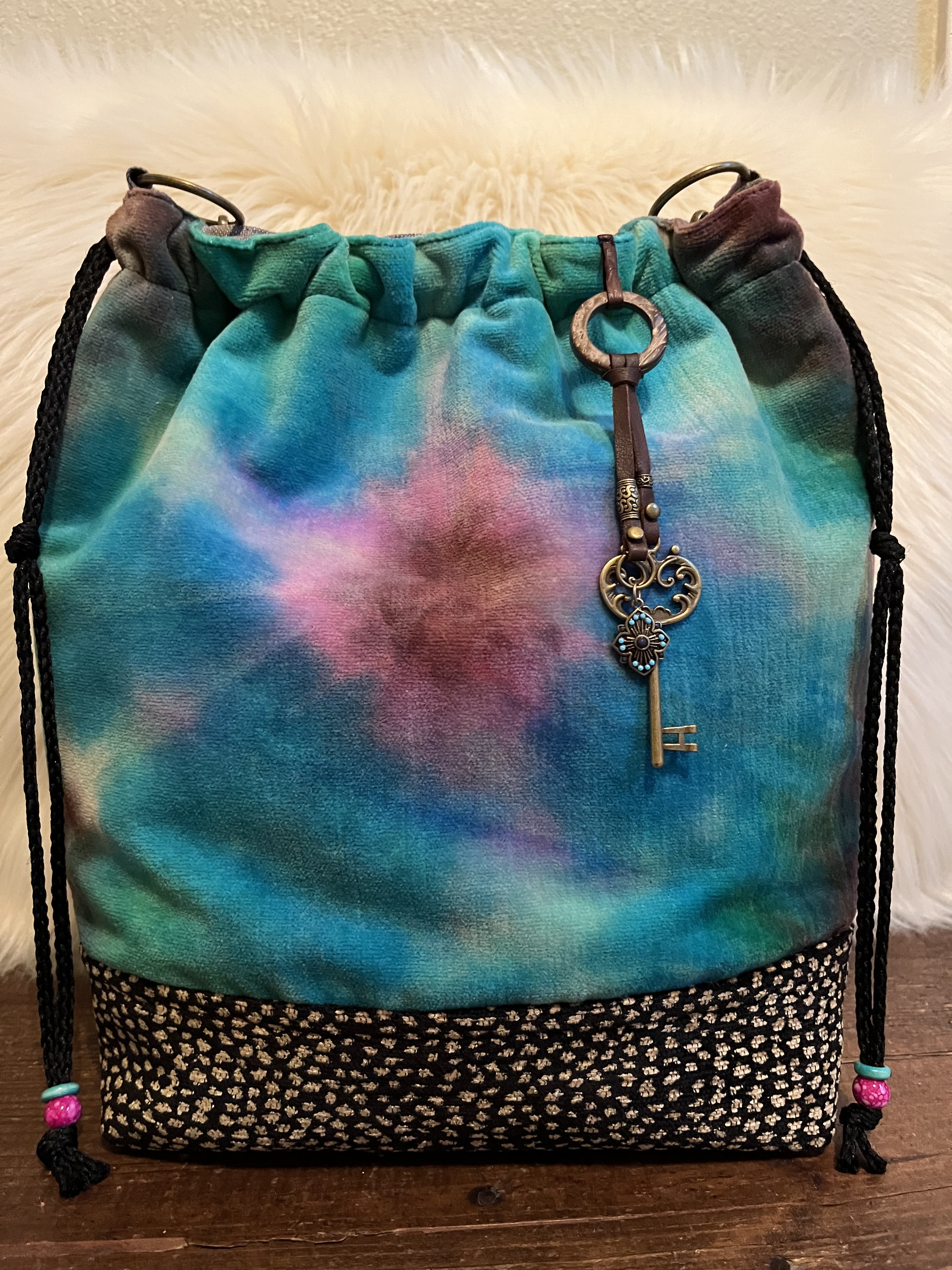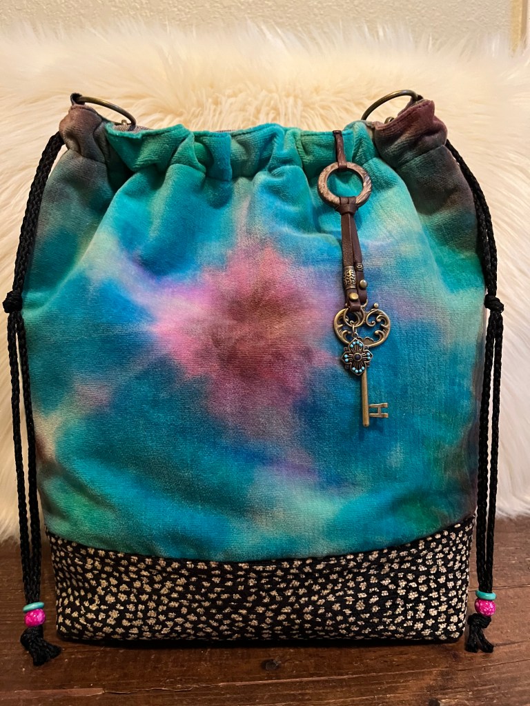 Key to Success This is a 13″ x 13″ x 5″ tie dyed Velvet handbag with a 32″ handmade strap, back Ms Me slip pocket, embellished front (key and trinket), 6 interior slip pockets as well as a zip pocket $74 Key to Success (front) Key to Success (interior) Key to Success (back) Share this:Tweet