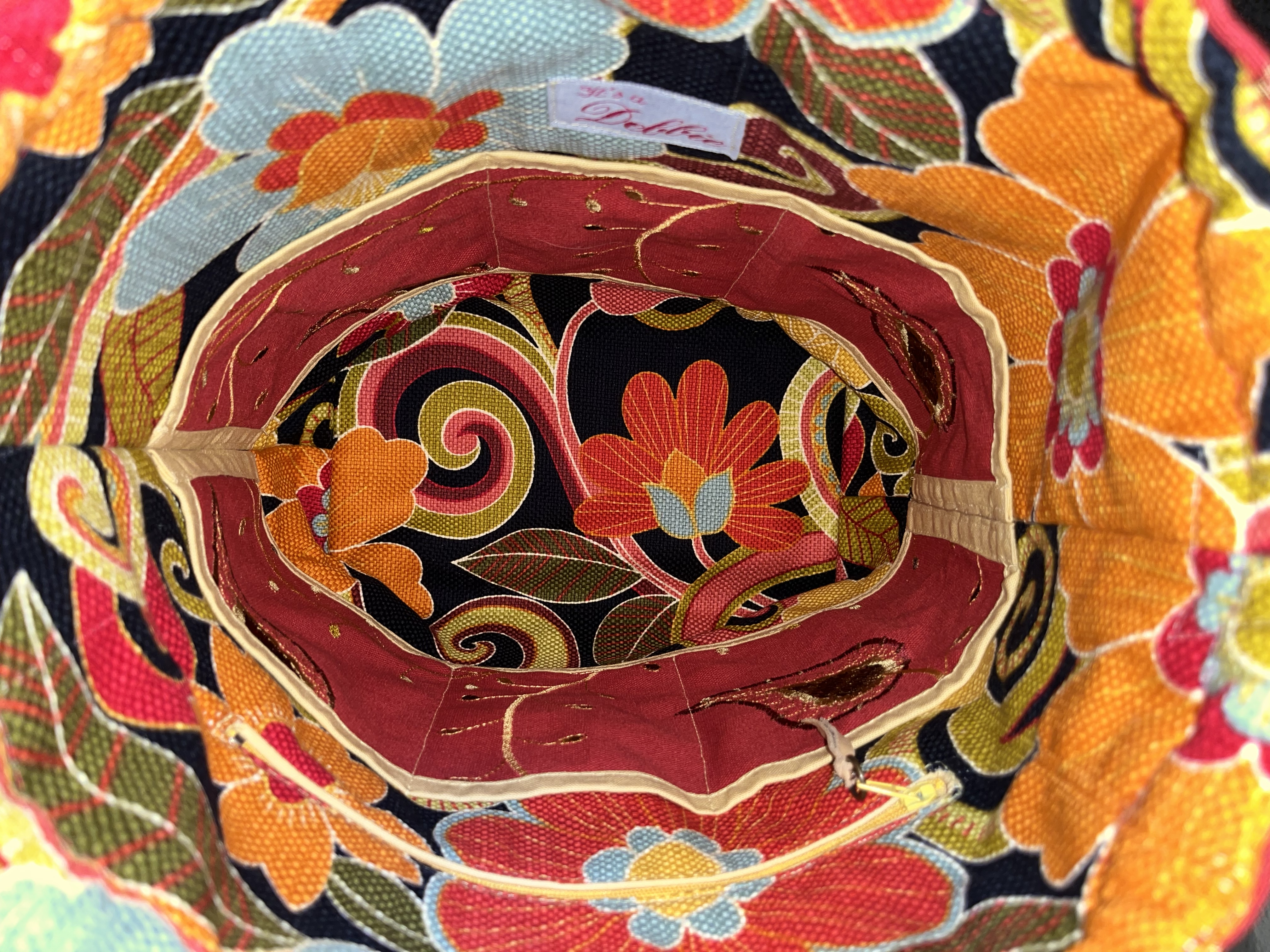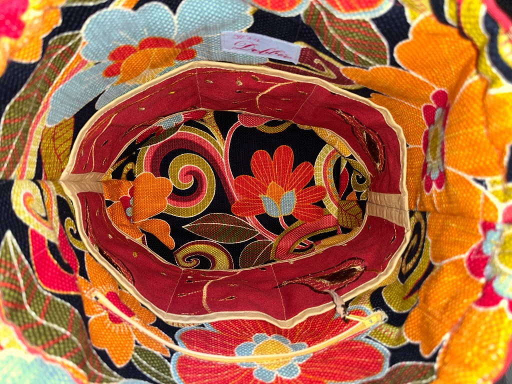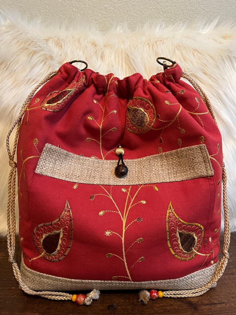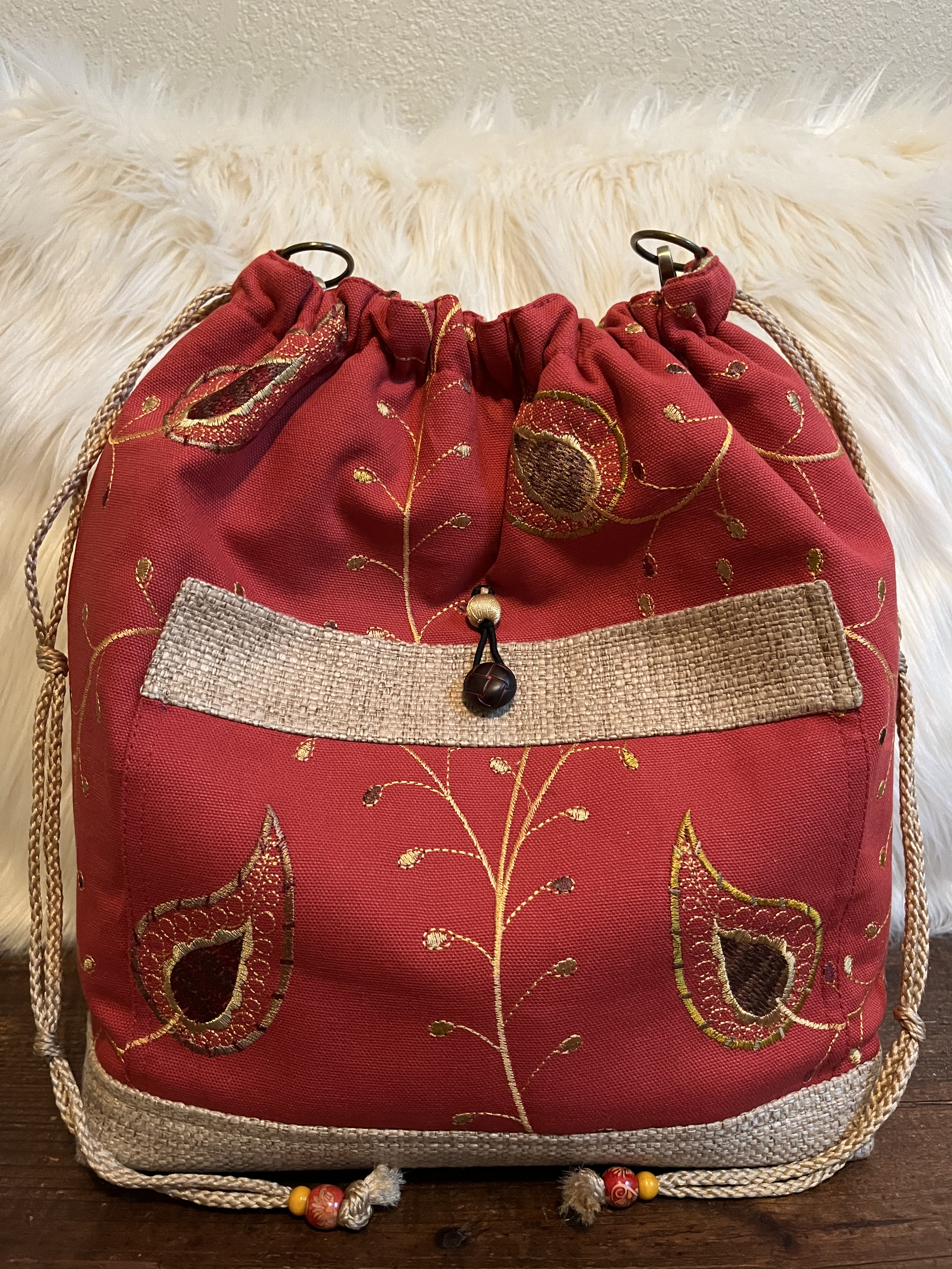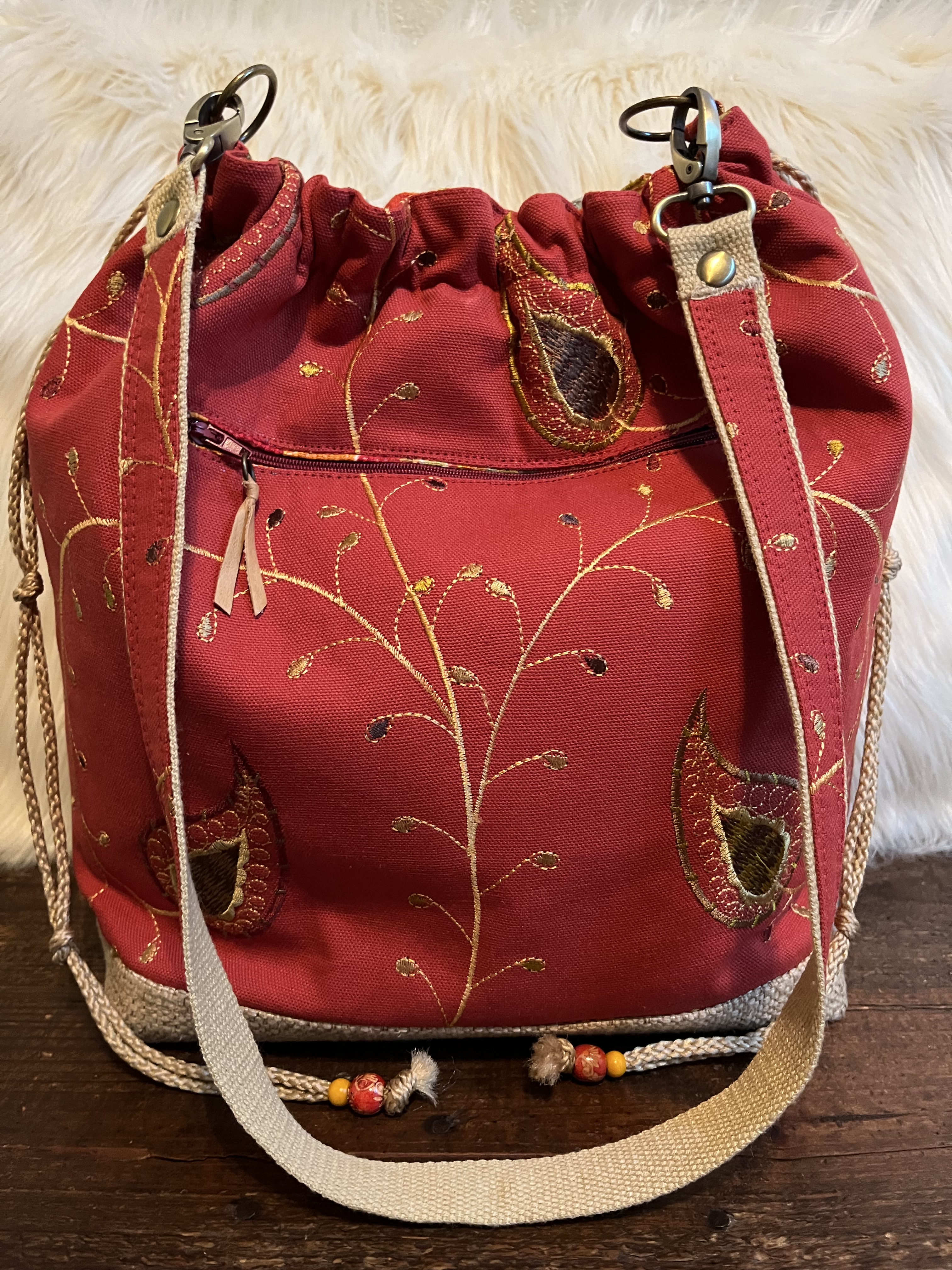 Lazy Paisleys This is a 14″ x 14″ x 5″ drawstring/snap closure, shoulder bag with a 32″ strap, purse feet, a front slip pocket with a button/loop closure, a back zip pocket, 6 interior slip pockets as well as a zip pocket. $74 Lazy Paisleys (front) Lazy Paisleys (interior) Lazy Paisleys (back) Share this:Tweet