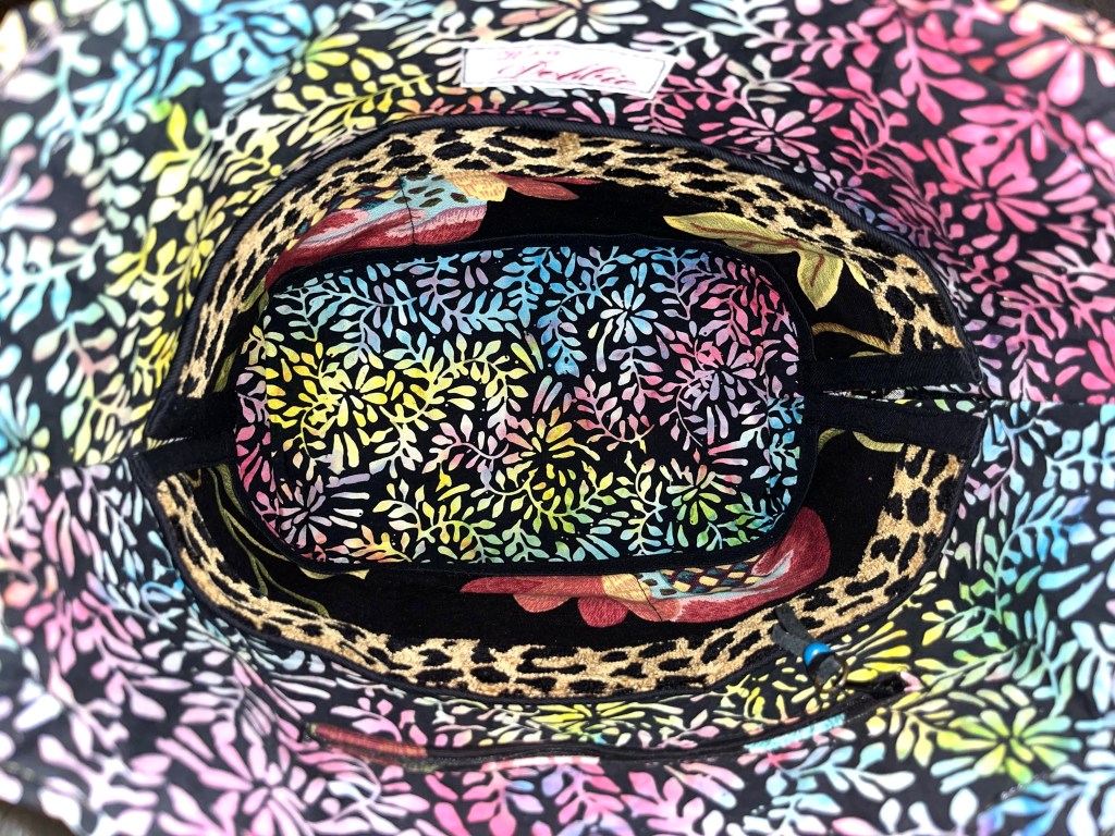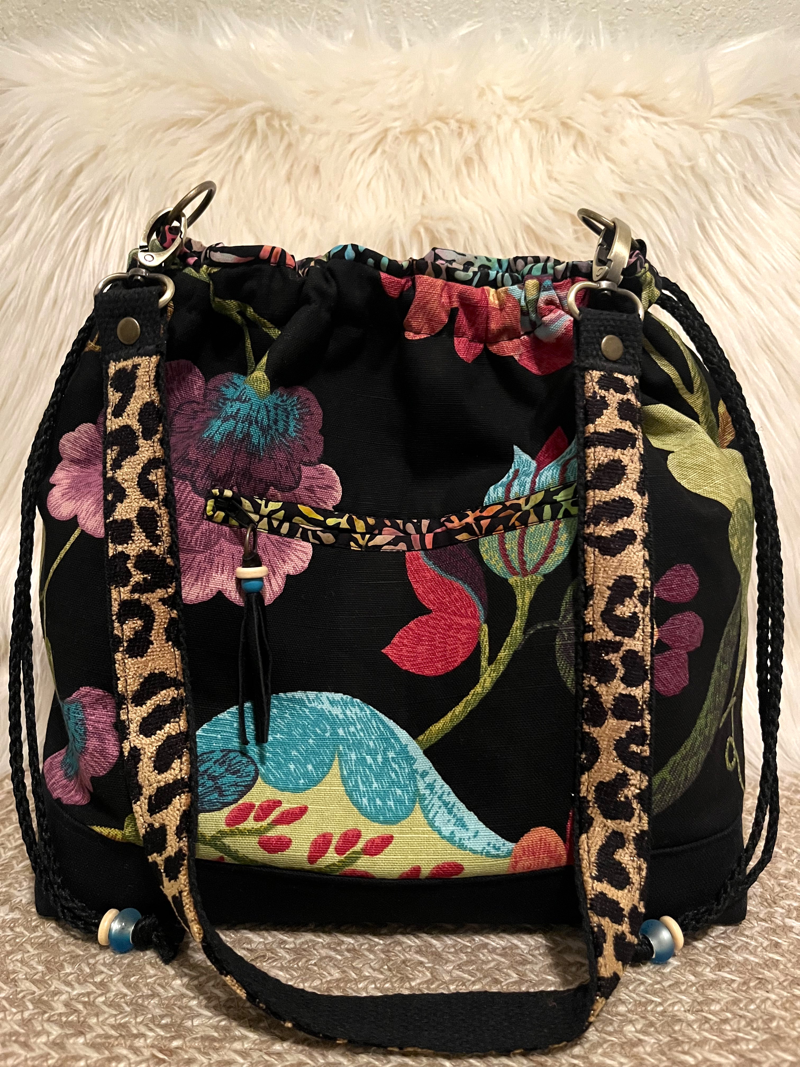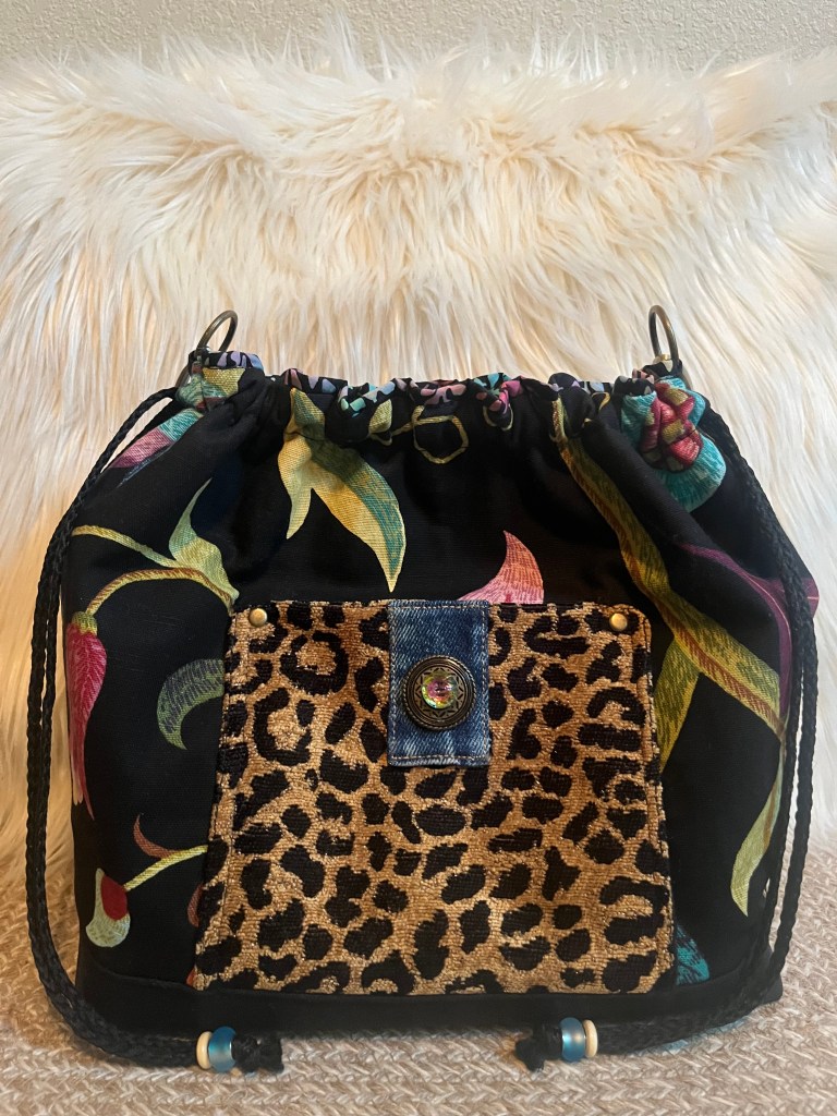Leopard in Bloom This is a 14″ x 11″ x 5″ Draw/snap close handbag with a 30″ strap, purse feet, a front I-phone Slip pocket, a back zip pocket, 6 interior slip pockets as well as a zip pocket. $78 Leopard in Bloom (front) Leopard in Bloom (interior) Leopard in Bloom (back) Share this:Tweet