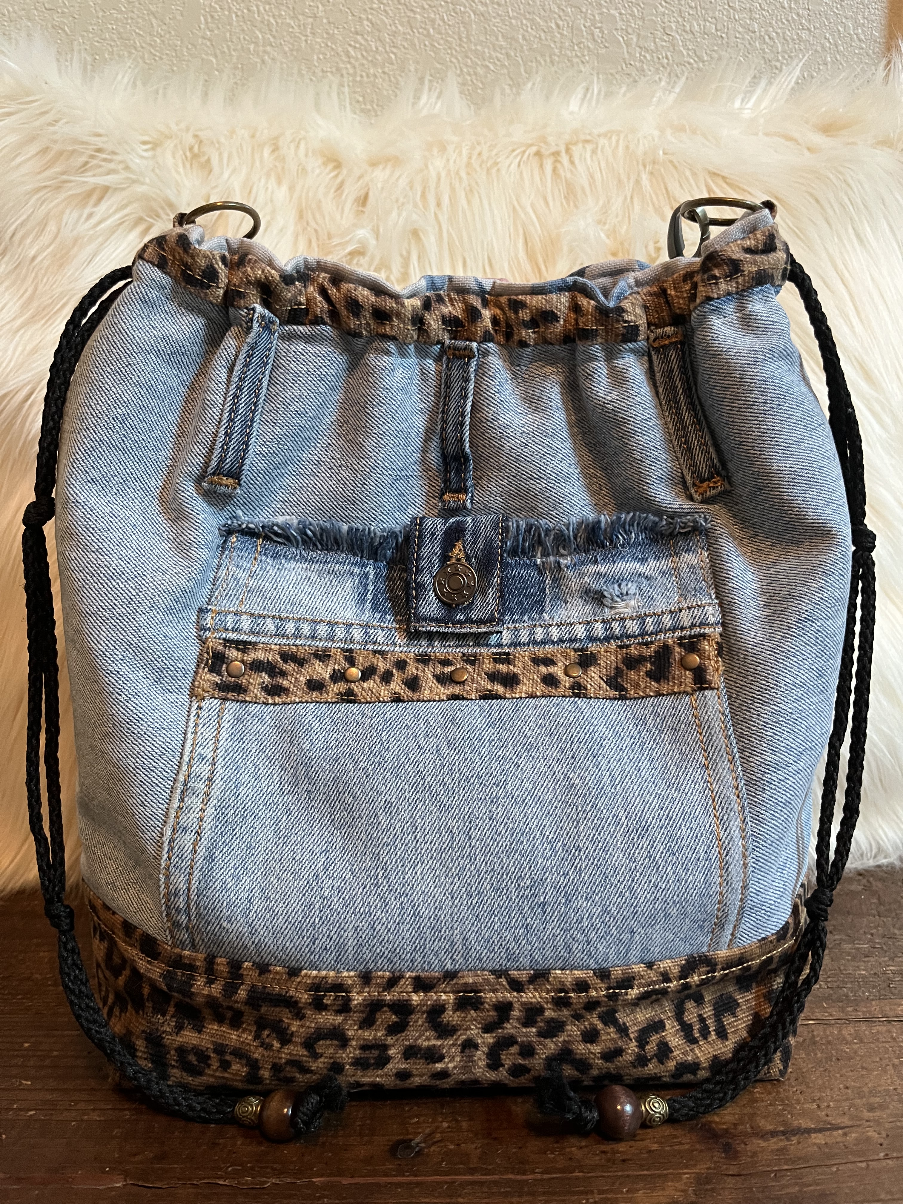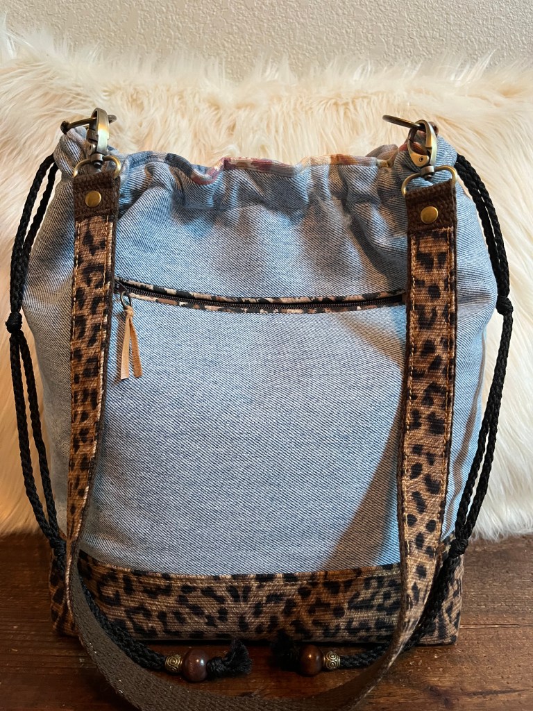 Leopard in Blue Jeans This is a 13″ x 12″ x 5″ drawstring/snap closure, shoulder bag with a 32″ strap, front slip pocket, back zip pocket, purse feet, 6 interior slip pockets as well as a zip pocket. $74 Leopard in Blue Jeans (front) Leopard in Blue Jeans (interior) Leopard in Blue Jeans (back) Share this:Tweet