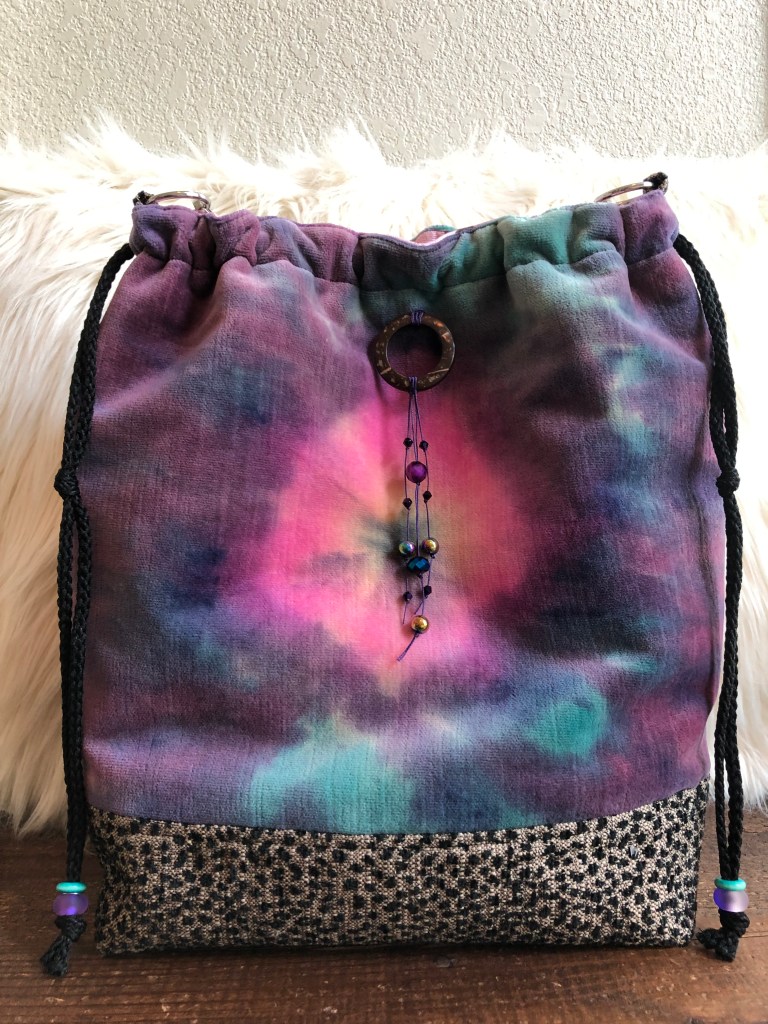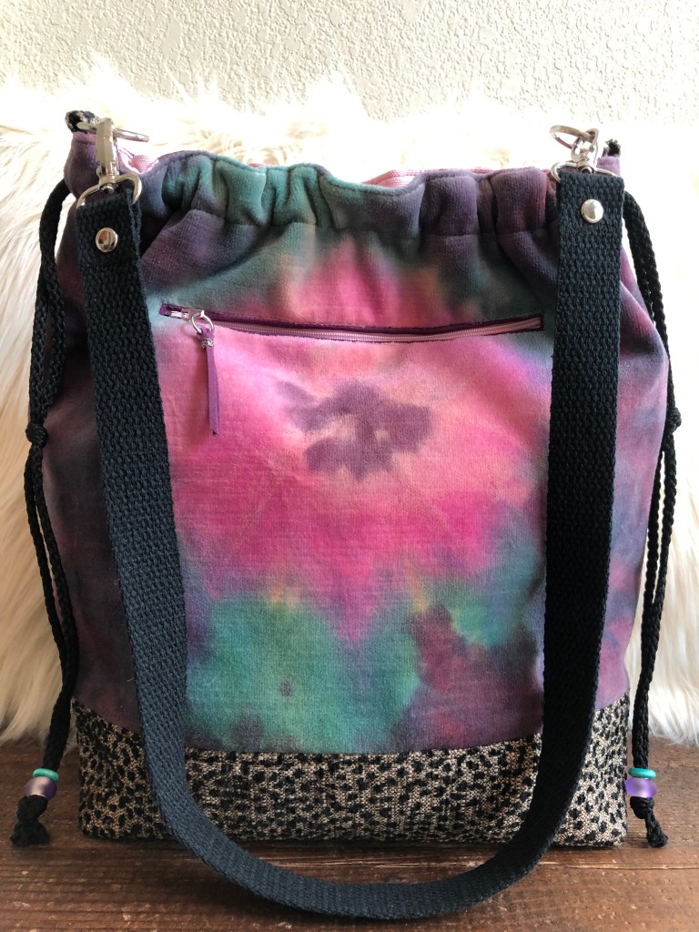Lone Pansy This is a 13″ x 13″ x 4″ Tie dyed Velvet, Drawstring/Shoulder handbag with a 33″ strap, a back zip pocket, purse feet, 6 interior slip pockets as well as an interior zip pocket. $74 Lone Pansy (front) Lone Pansy (interior) Lone Pansy (back) Share this:Tweet