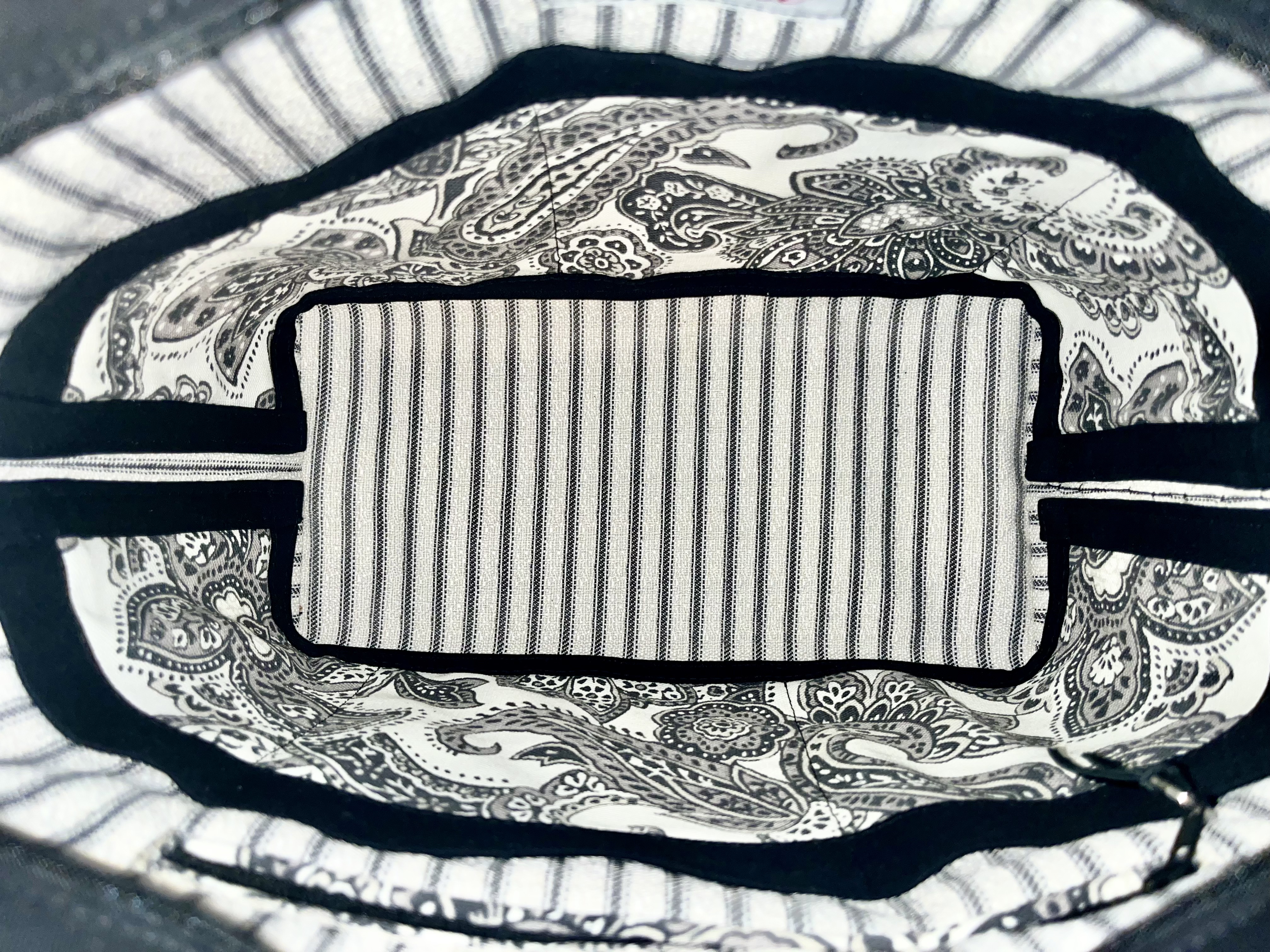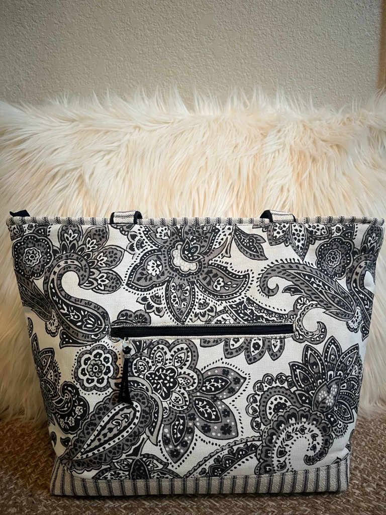 Love Letter This is a 15” x 11” x 6” Tote with 26” straps, a zip closure, front double slip pockets, a back zip pocket, 6 interior slip pockets as well as a zip pocket and purse feet. $76 Love Letter (front) Love Letter (interior) Love Letter (back) Share this:Tweet