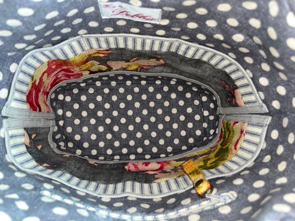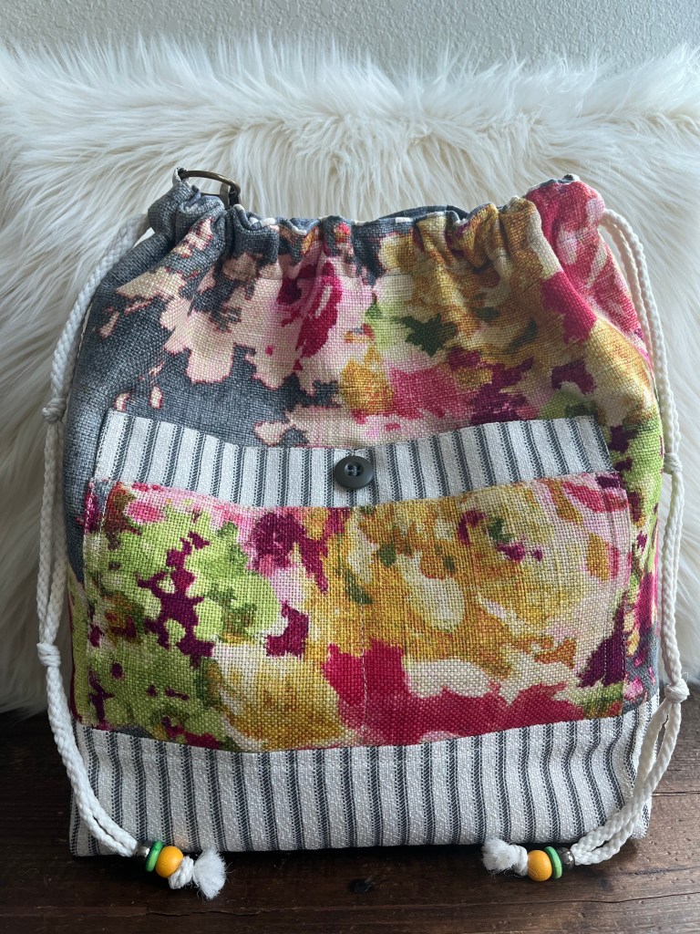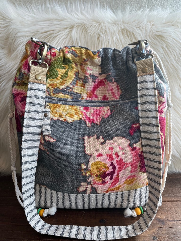 Not Exactly This is a 14″ x 13″ x 5″ Drawstring/snap closure, a 33″ strap, purse feet, front double slip pockets, a back zip pocket, 6 interior slip pockets as well as a zip pocket. $74 Not Exactly (front) Not Exactly (interior) Not Exactly (back) Share this:Tweet