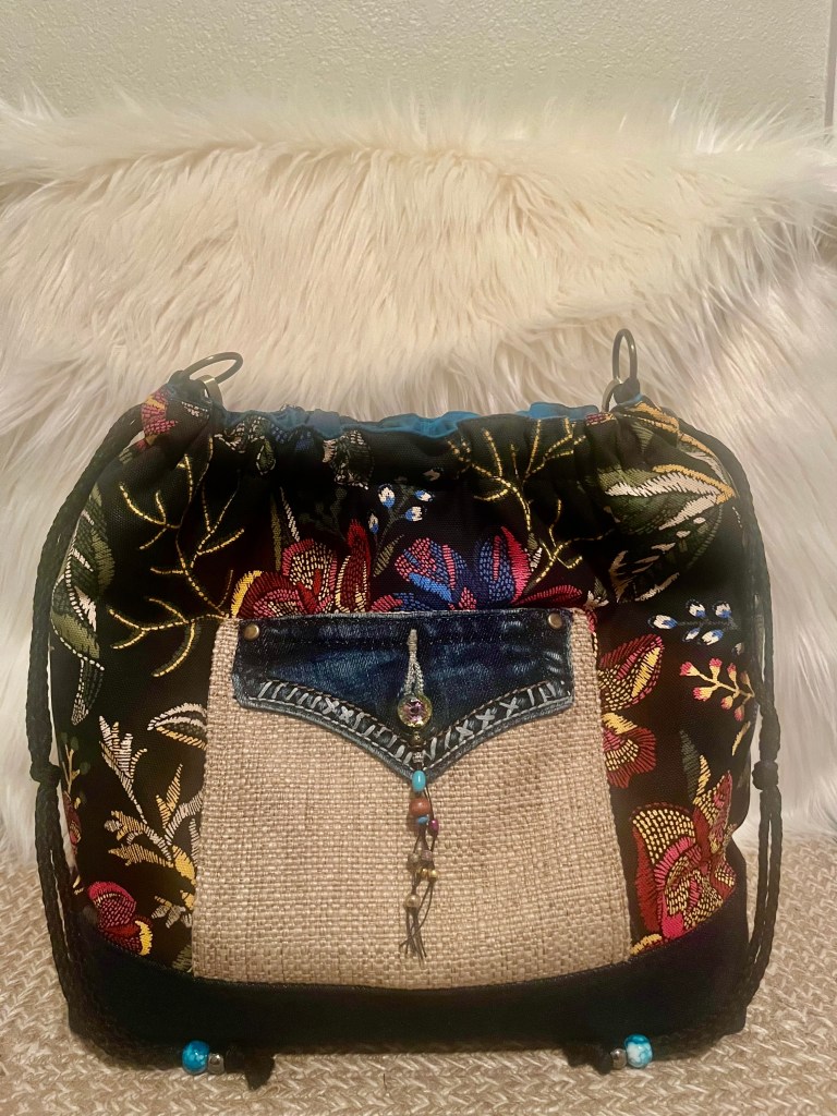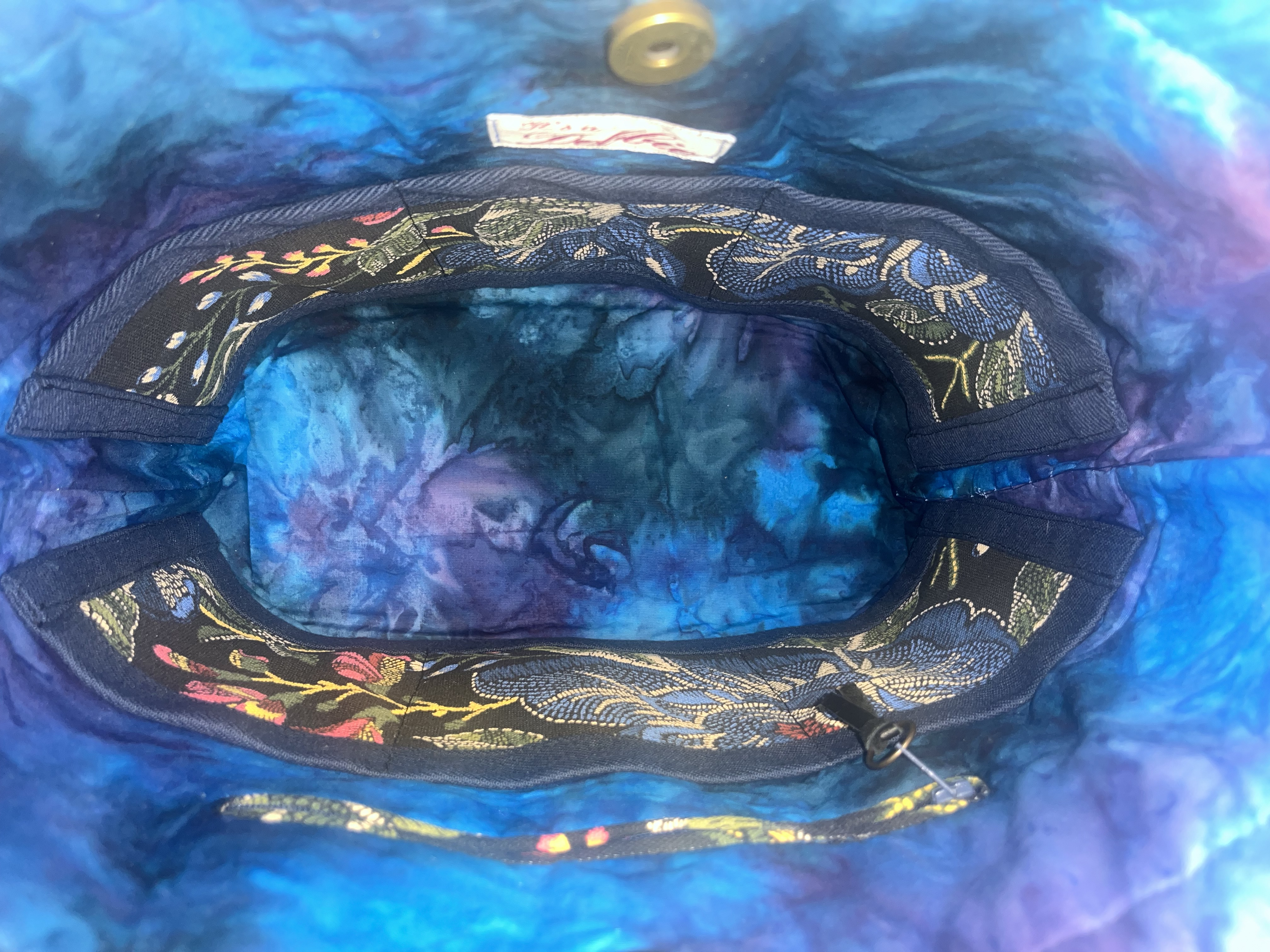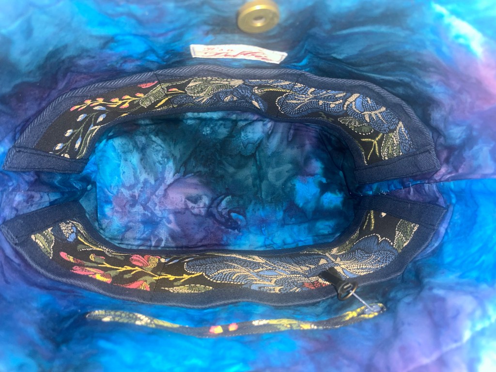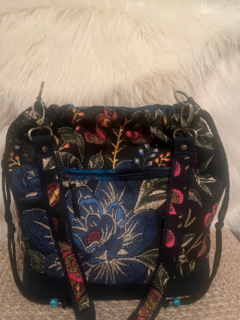 Repeat the Sound This is a 14″ x 12″ x 5″ Shoulder Handbag with a 30″ strap, a front slip pocket for I-phone, back zip pocket, 6 interior slip pockets as well as a zip pocket and purse feet. $74 Repeat the Sound (front) Repeat the Sound (interior) Repeat the Sound (back) Share this:Tweet