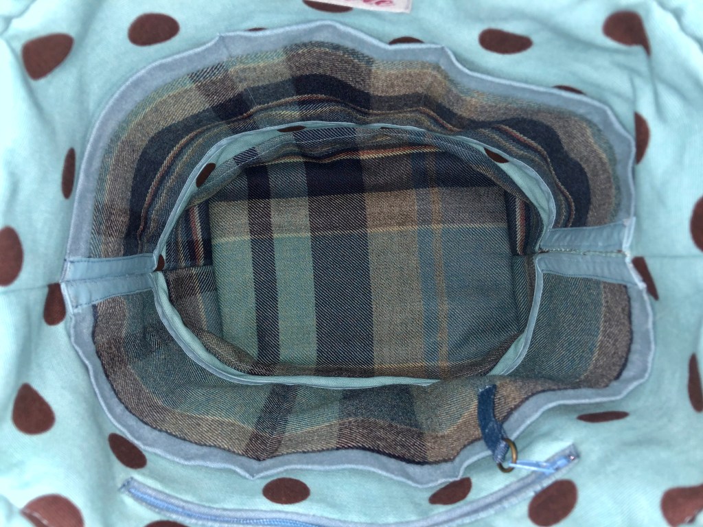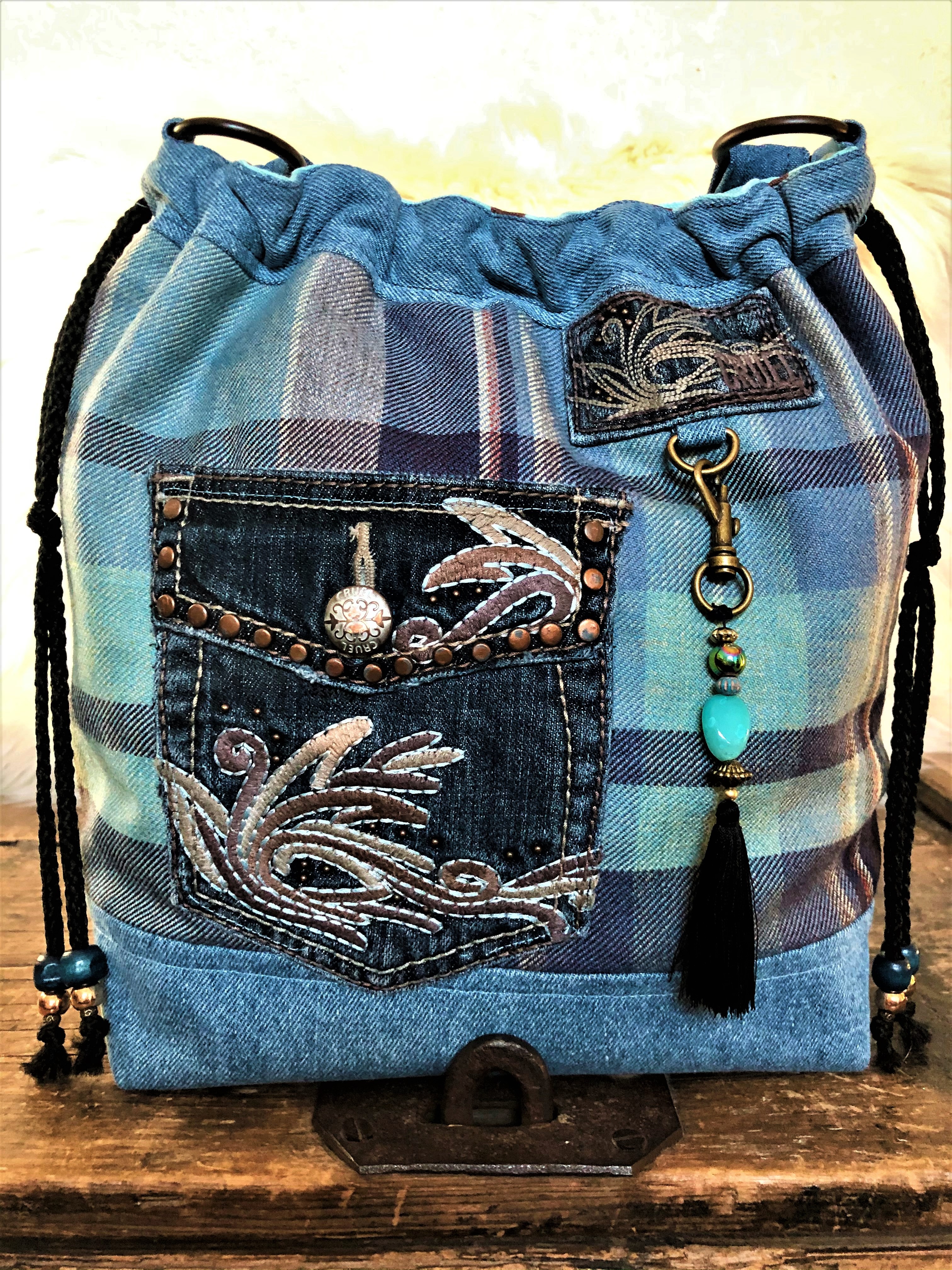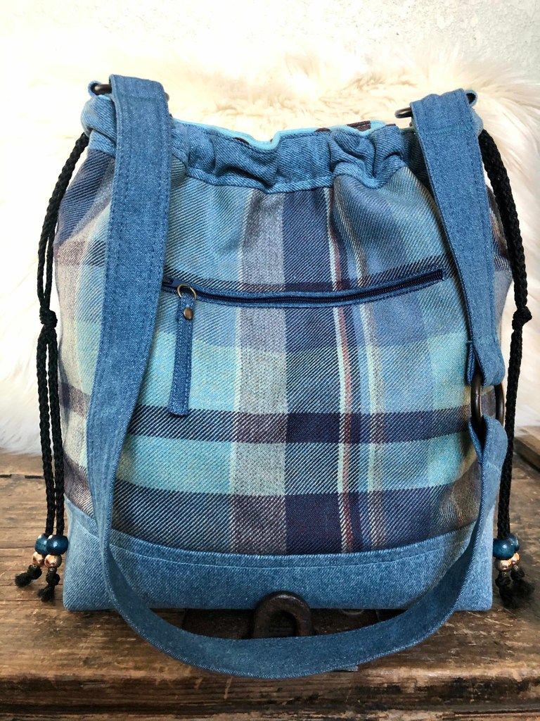 Shades a Blue This is a 14″x 12″ x 5″ Drawstring/Shoulder Bag with a 32″ strap, purse feet, a front I-phone slip pocket, a back zip pocket, 6 interior slip pockets as well as a zip pocket and a Snap and drawstring closure. $72 Shades a Blue (front) Shades a Blue (interior) Shades a Blue (back) Share this:Tweet
