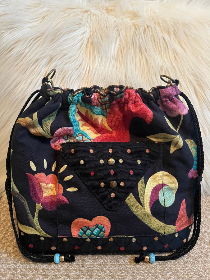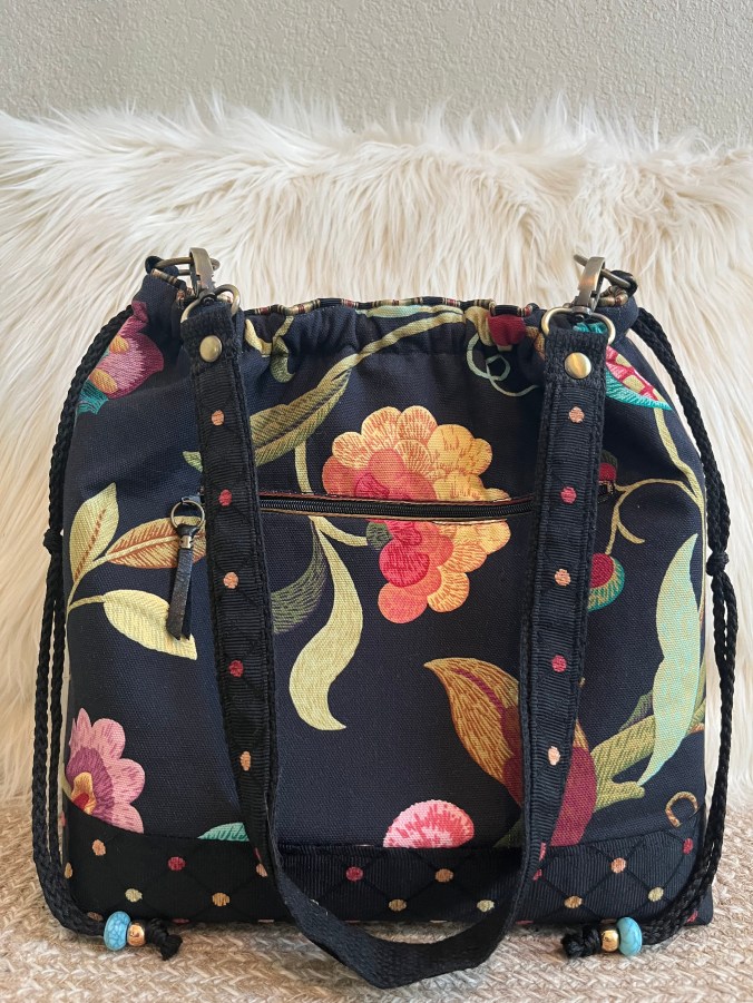 Show Off This is a 14″ x 12″ x 5″ Drawstring/Shoulder Bag with a 32″ strap, a front slip pocket, a back zip pocket, purse feet, 6 interior slip pockets as well as a zip pocket. $76 Show Off (front) Show Off (interior) Show Off (back) Share this:Tweet