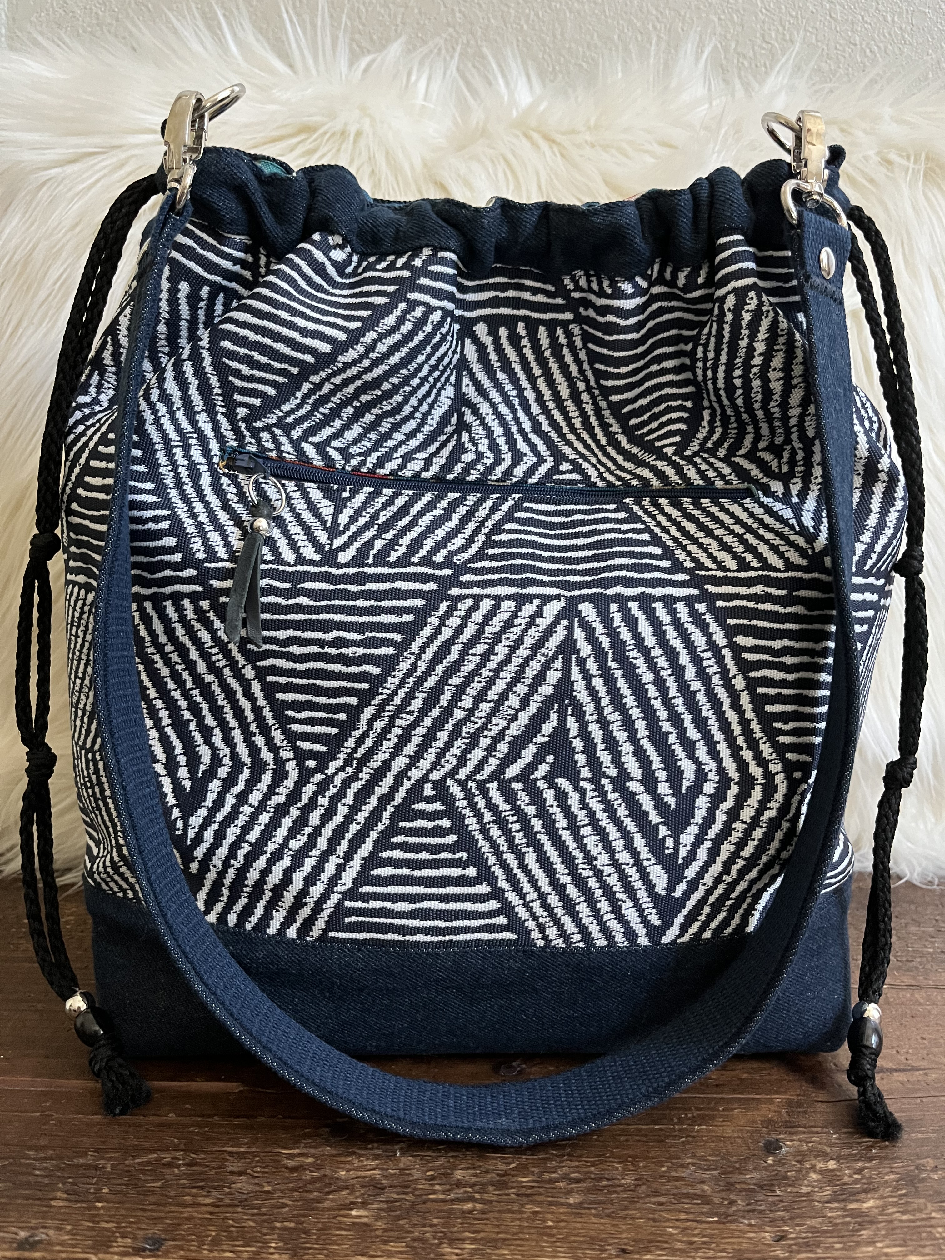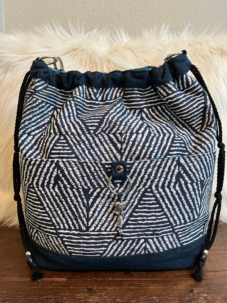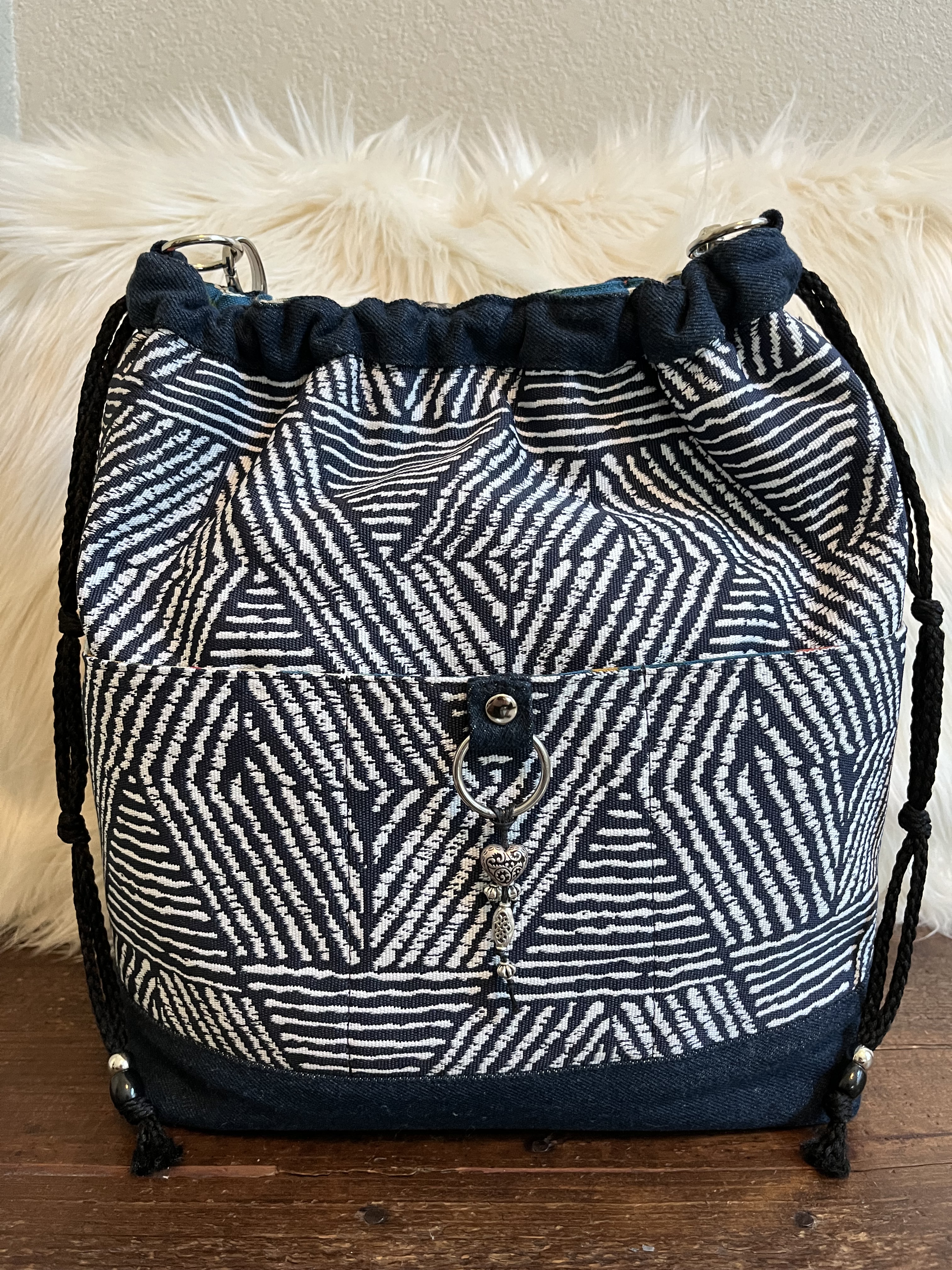 Tangled Up In Blue This is a 14″ x 13″ x 5″with a 32″ strap, 3 front slip pockets, a back zip pocket, purse feet, 6 interior slip pockets, a zip pocket, and a drawstring/snap closure. $74 Tangled Up In Blues (front) Tangled Up In Blues (interior) Tangled Up In Blues (back) Share this:Tweet