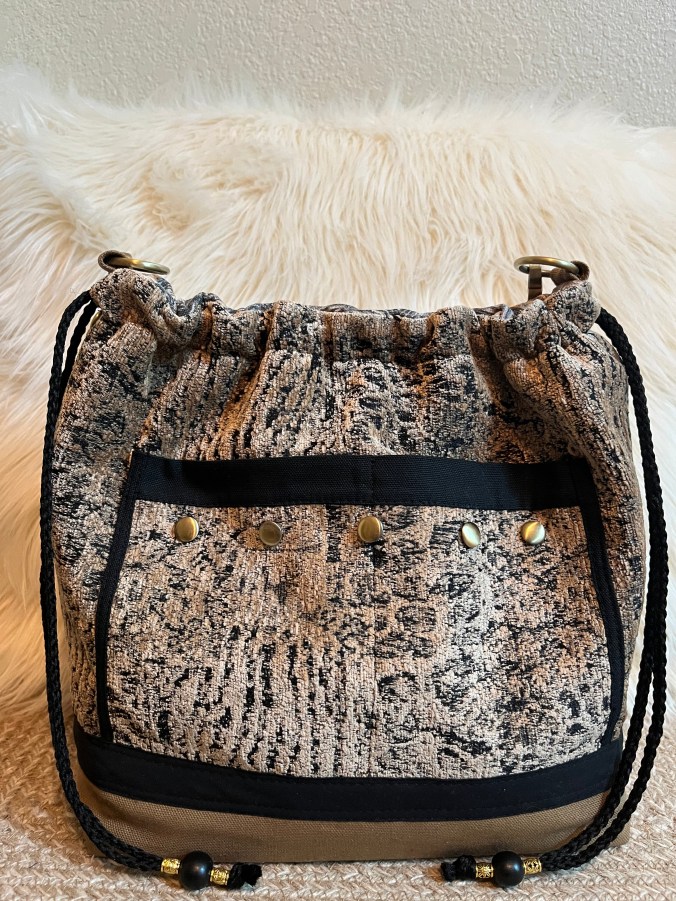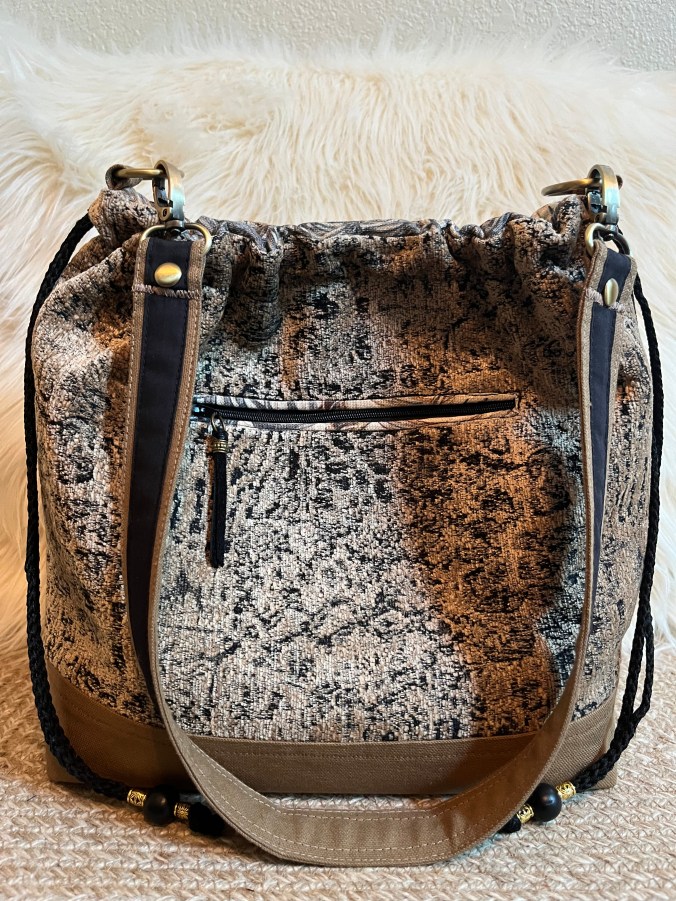 Teddy Bear This is a 14″ x 11″ x 5″ snap/draw closure, shoulder handbag with a 30″ strap, purse feet, double front slip pockets, a back zip pocket, 6 interior slip pockets as well as a zip pocket. $74 Teddy Bear (front) Teddy Bear (interior) Teddy Bear (back) Share this:Tweet