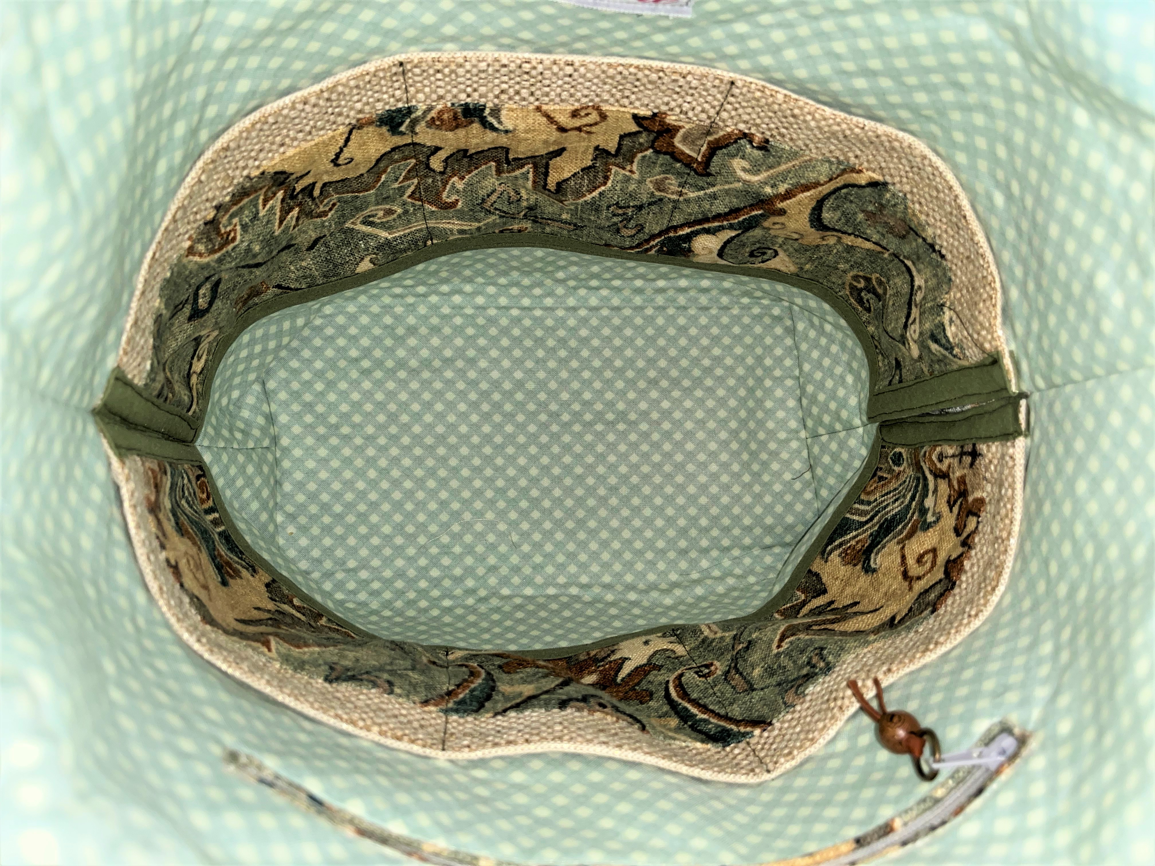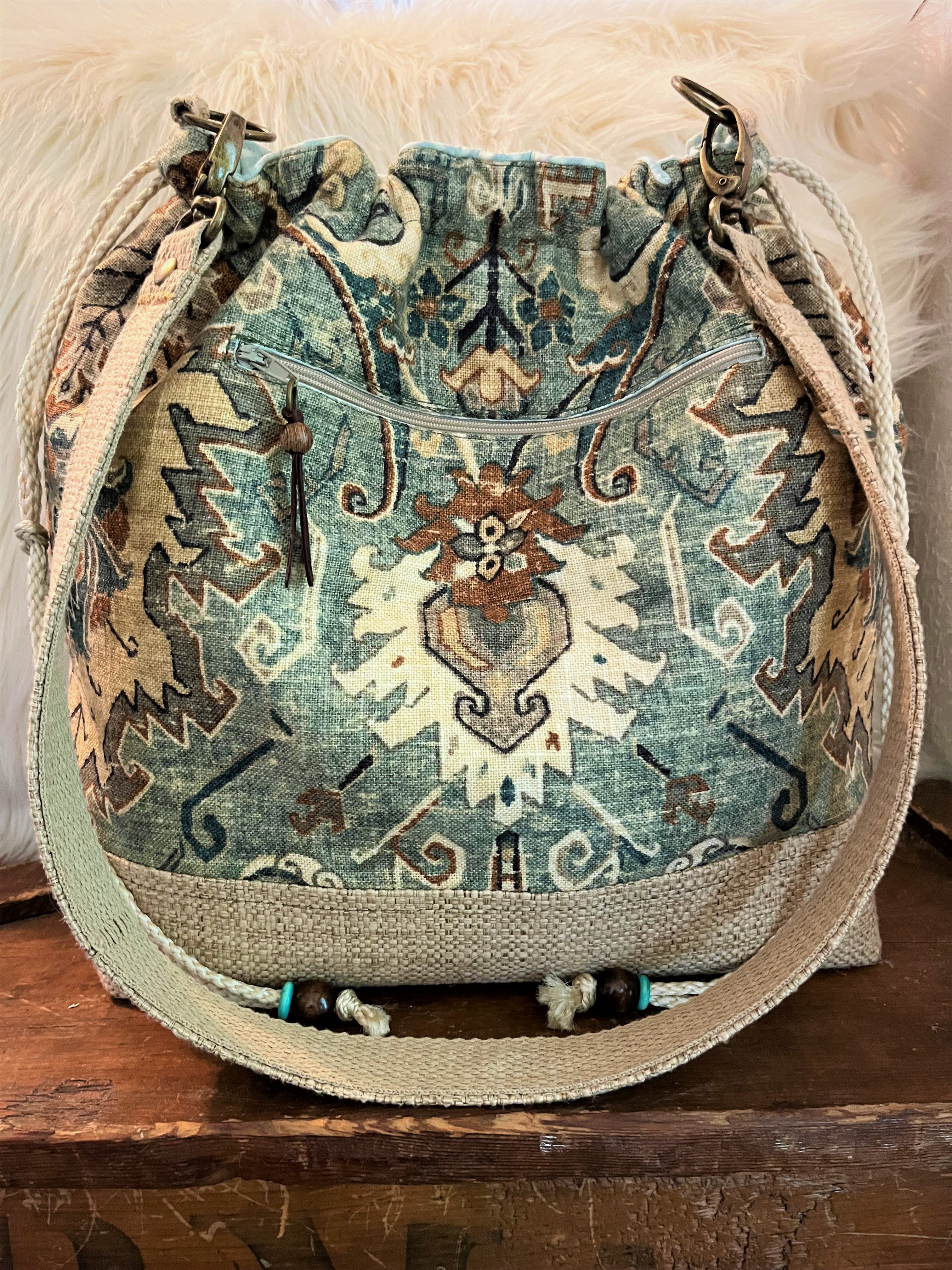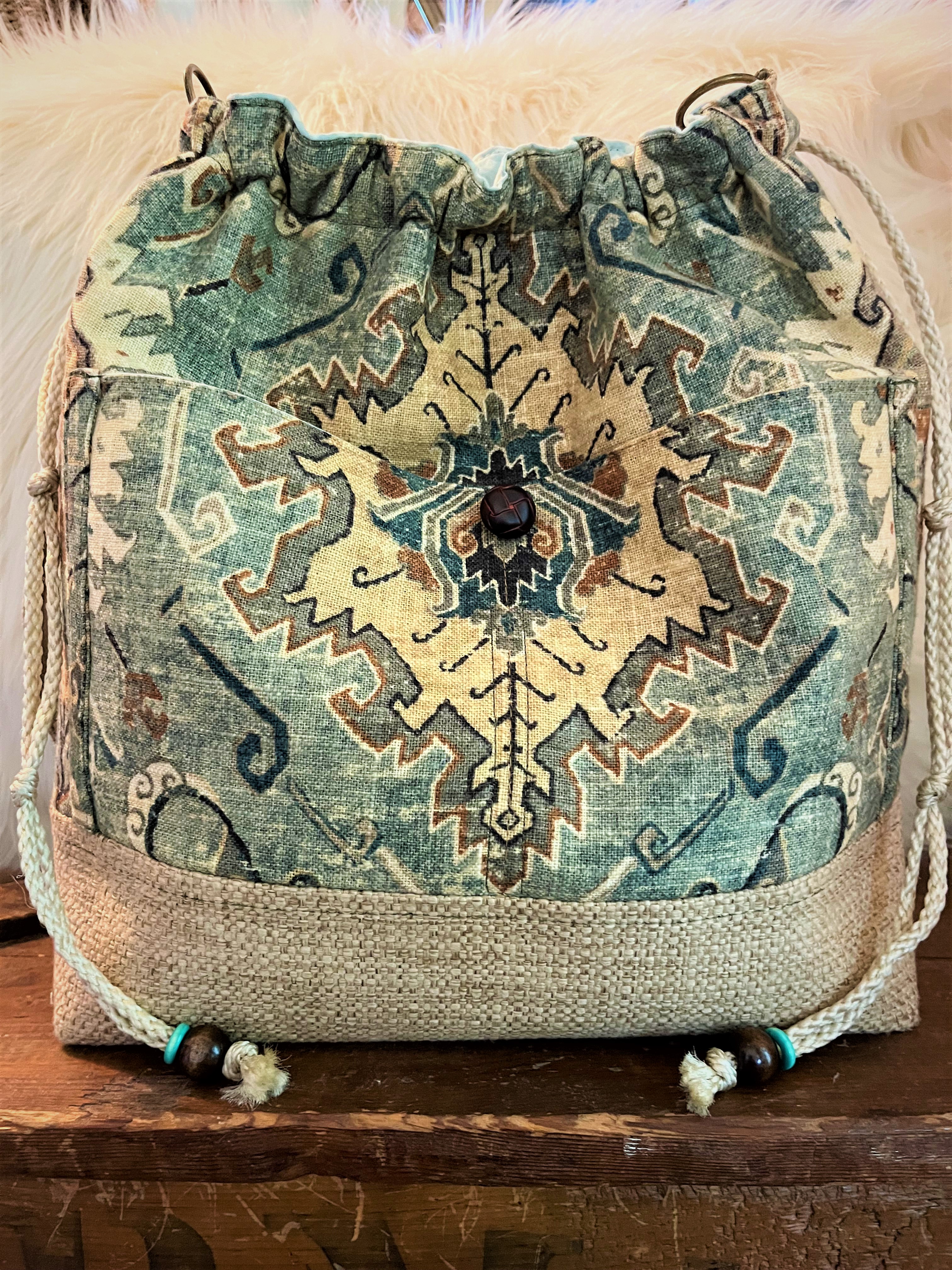Tibetan Dream This is a 14″ x 13″ x 5″ Drawstring/snap closure handbag with a 33″ strap, purse feet, 2 front slip pockets, a back zip pocket, 6 interior slip pockets as well as a zip pocket $74 Tibetan Dream (front) Tibetan Dream (interior) Tibetan Dream (back) Share this:Tweet