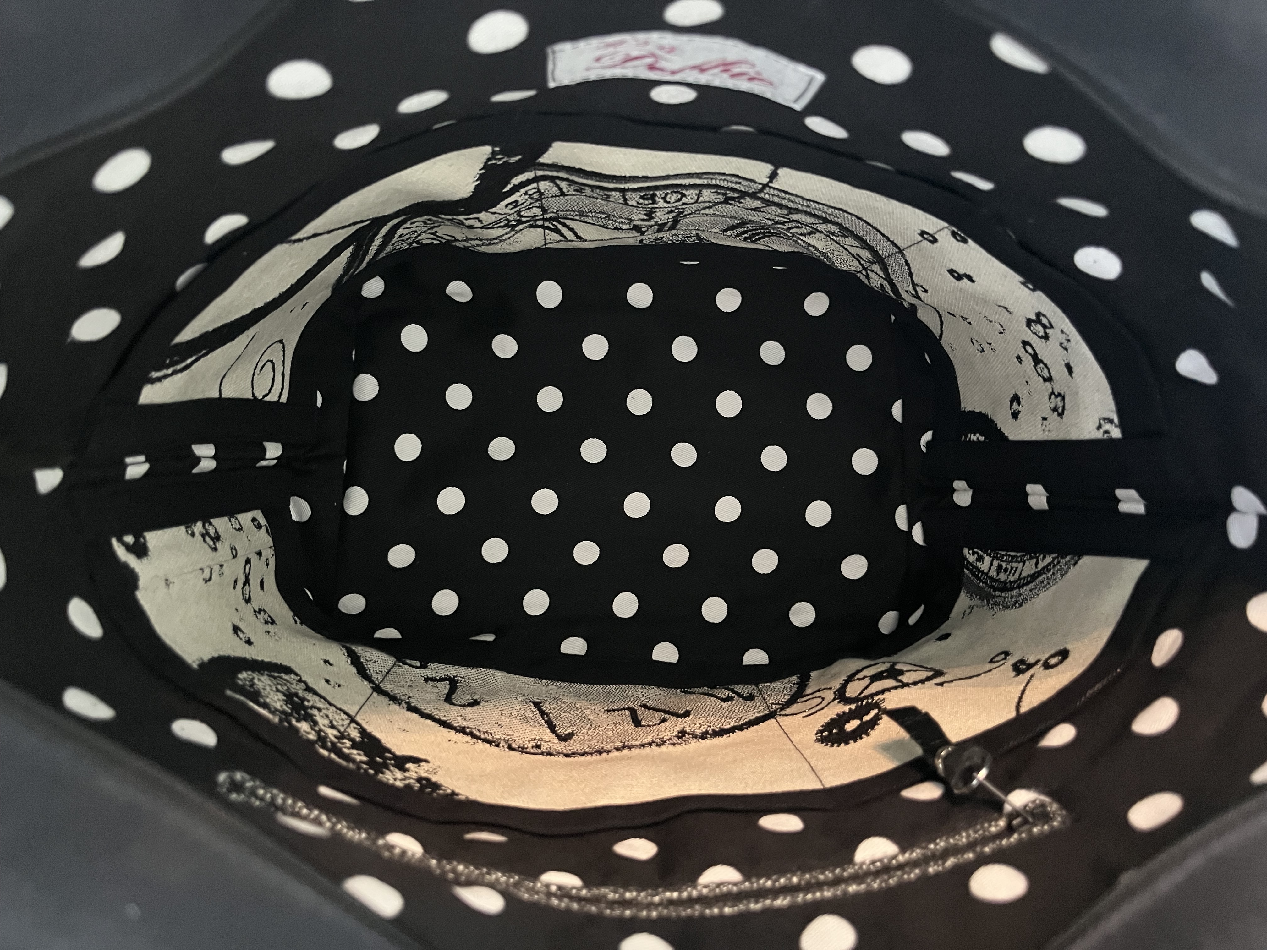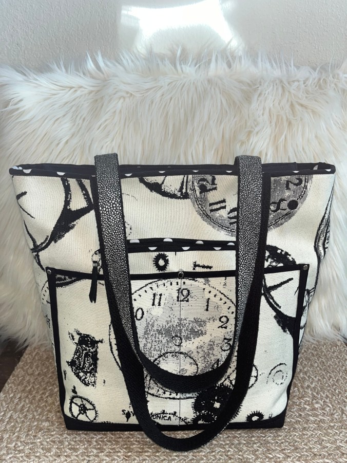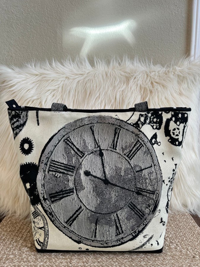 Time after Time This is a 14.5” x 12.5” x 6” Tote with 27” straps, Zip closure, purse feet, 2 front slip pockets, as well as a zip pocket, 6 interior slip pockets and a zip pocket too. $78 Time after Time (front) Time after Time (interior) Time after Time (back) Share this:Tweet