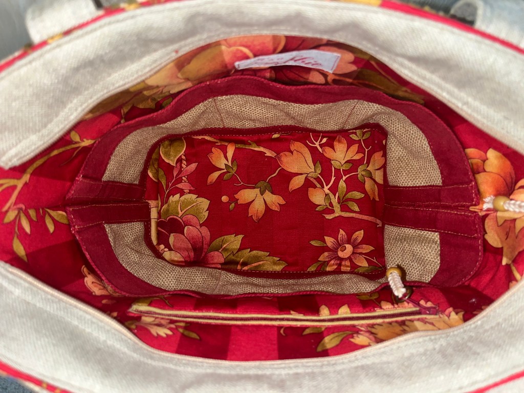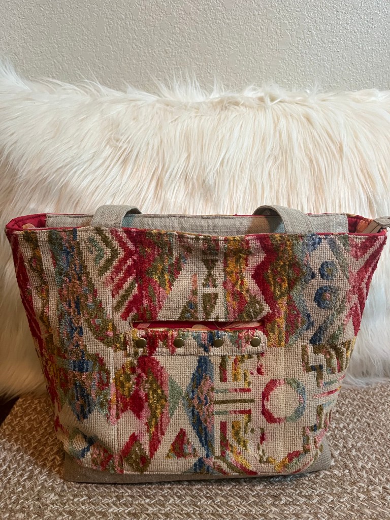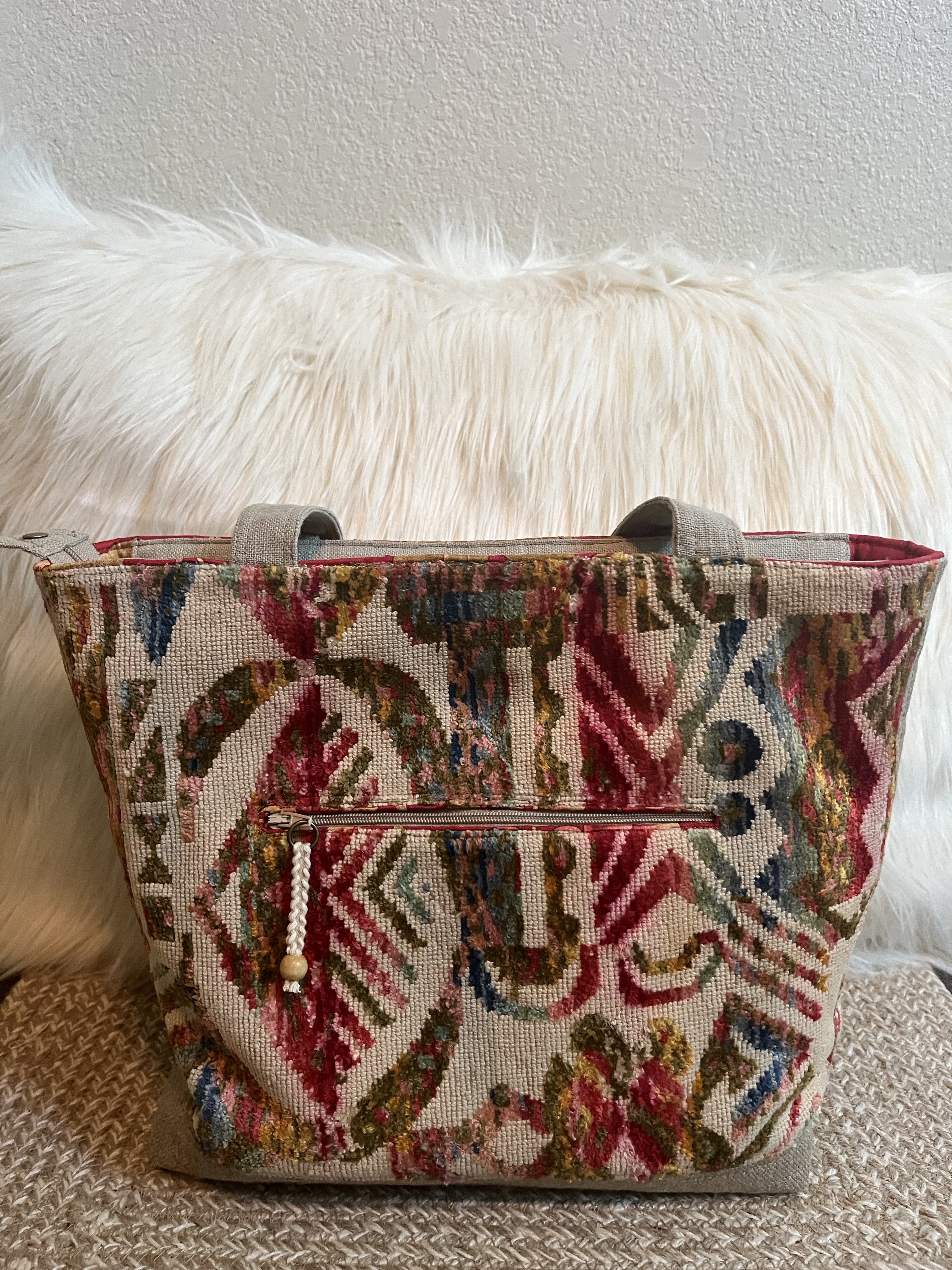 Two Worlds This is a 14” x 11” x 5” Tote with 28” straps, purse feet, a zip closure, front i-phone slip pocket, back zip pocket, 6 interior slip pockets as well as a zip pocket. $72 Two Worlds (front) Two Worlds (interior) Two Worlds (back) Share this:Tweet