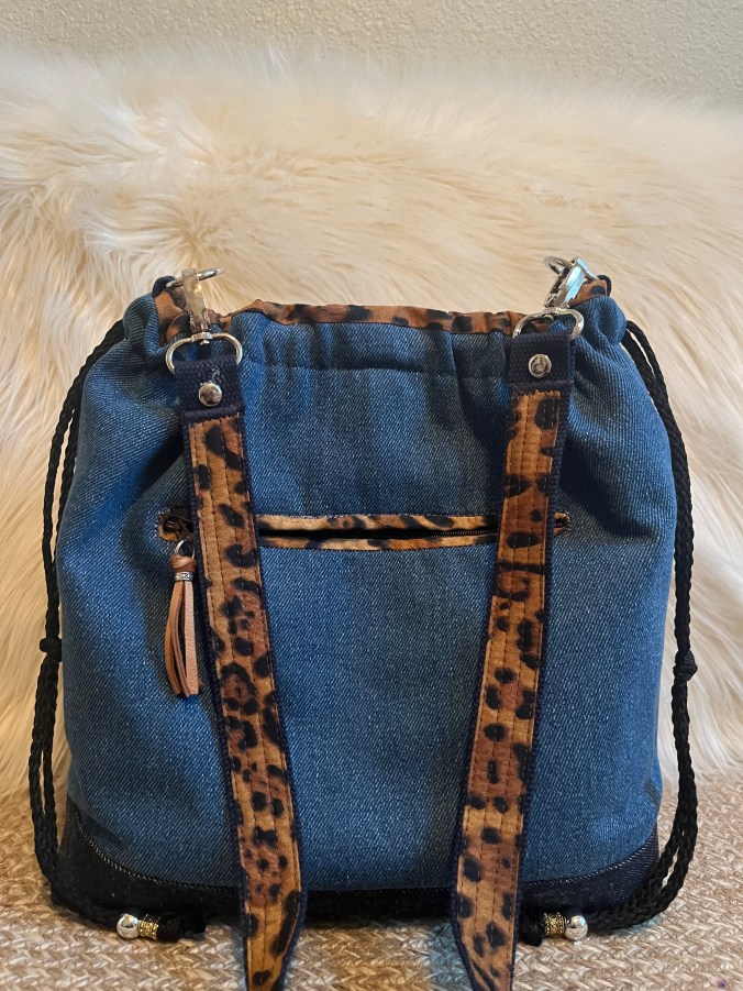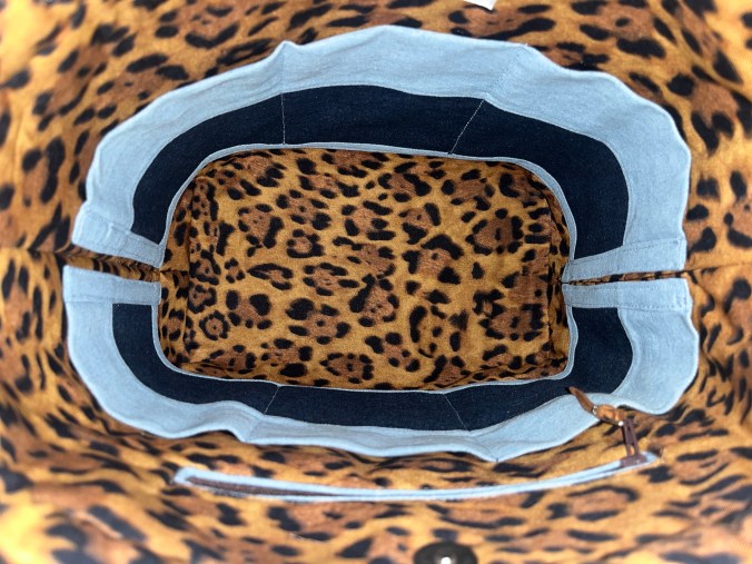 Wild Side This is a 14″ x 11″ x 5″ draw/snap Closure, shoulder handbag with a 29″ strap, a front slip pocket, a back zip pocket, purse feet, 6 interior slip pockets as well as a zip pocket. $76 Wild Side (front) Wild Side (interior) Wild Side (back) Share this:Tweet